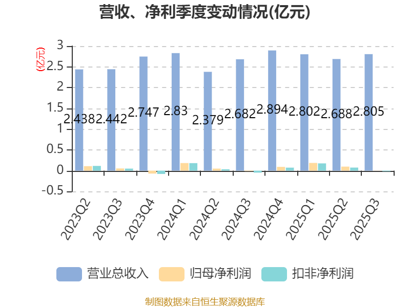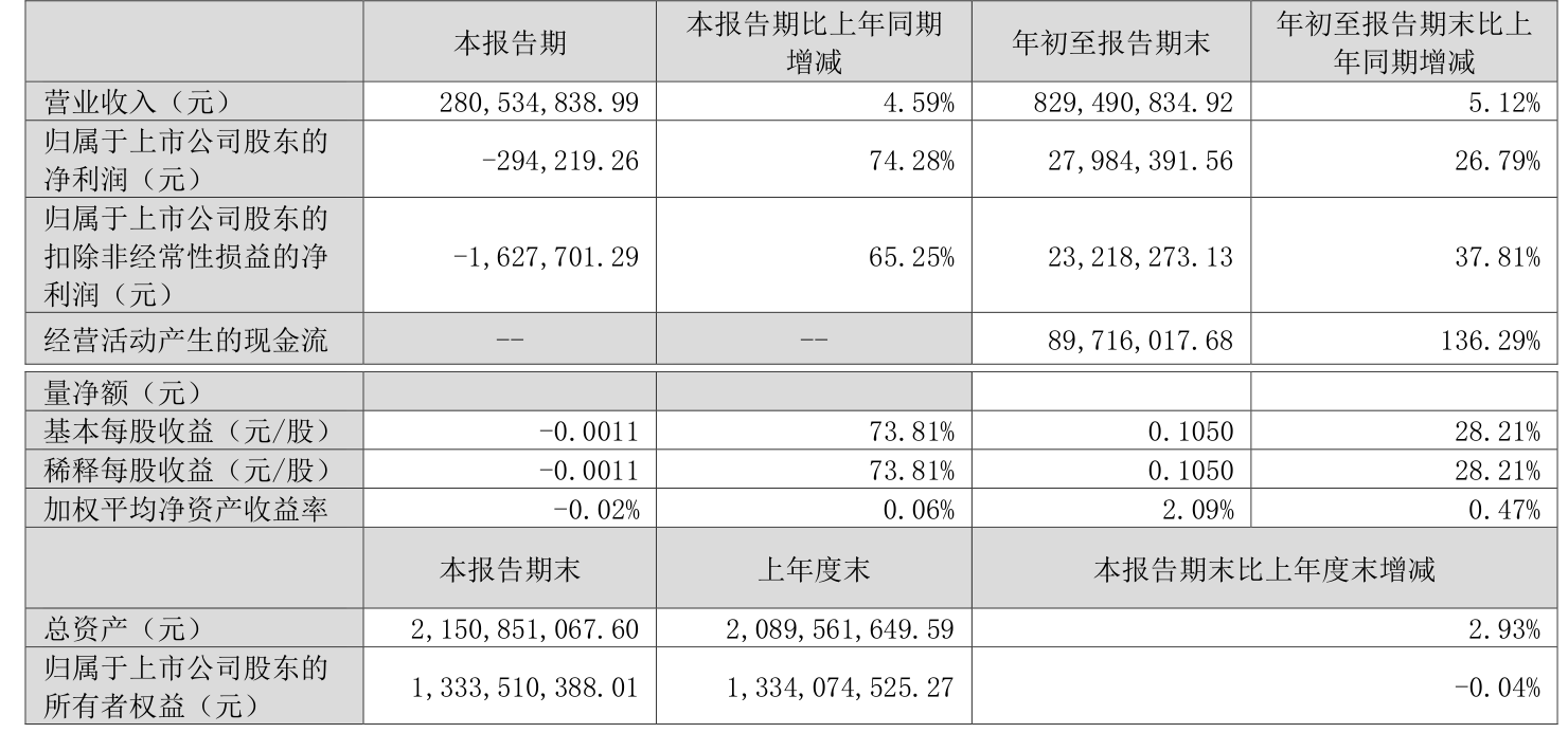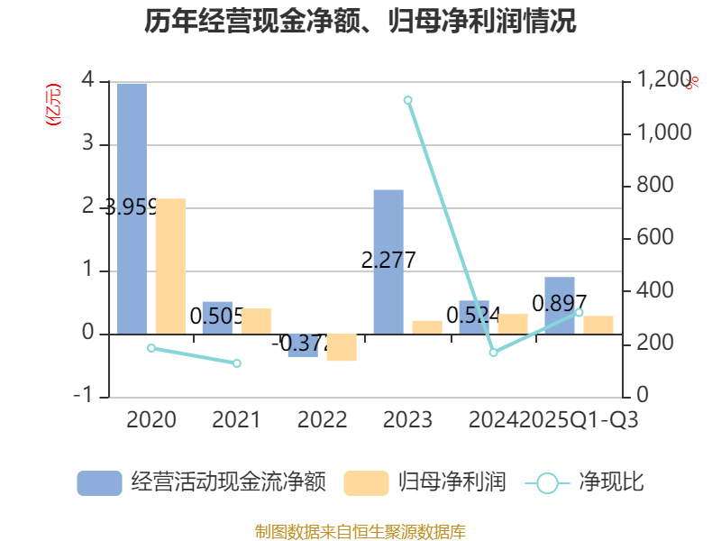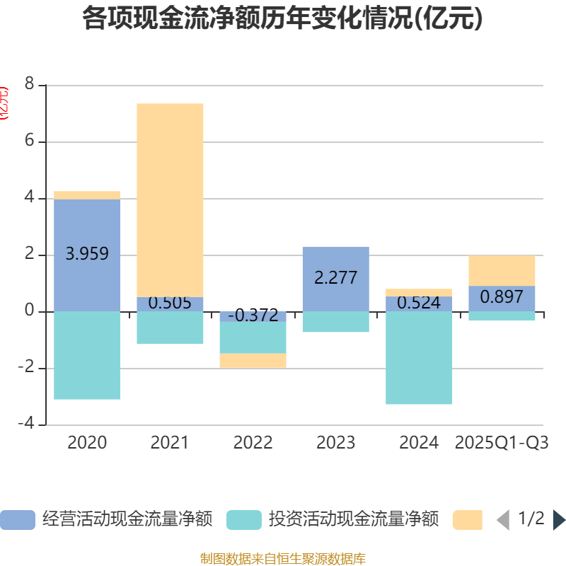 2025年前三季度,公司经营活动现金流净额为8971.6万元,同比增长136.29%;筹资活动现金流净额1.08亿元,同比增加1.61亿元;投资活动现金流净额-3237.56万元,上年同期为-2.48亿元。