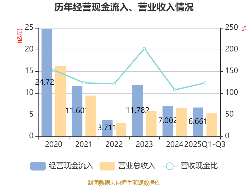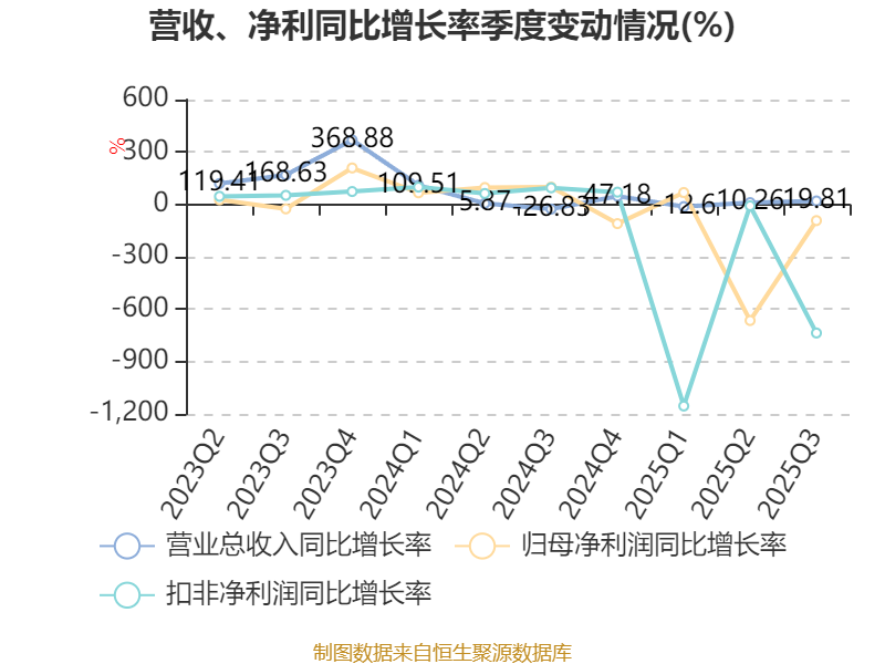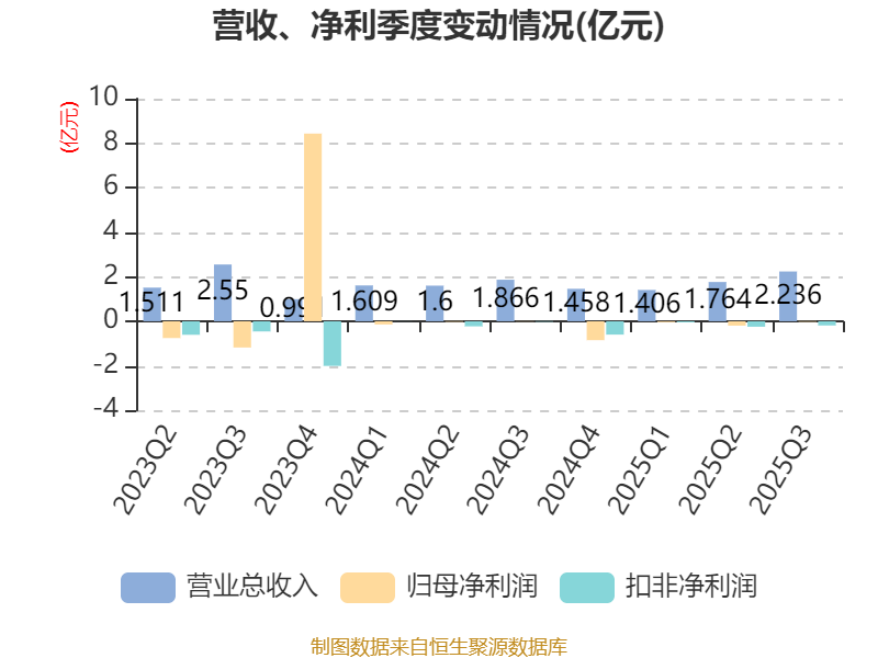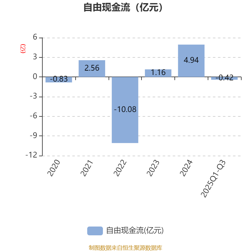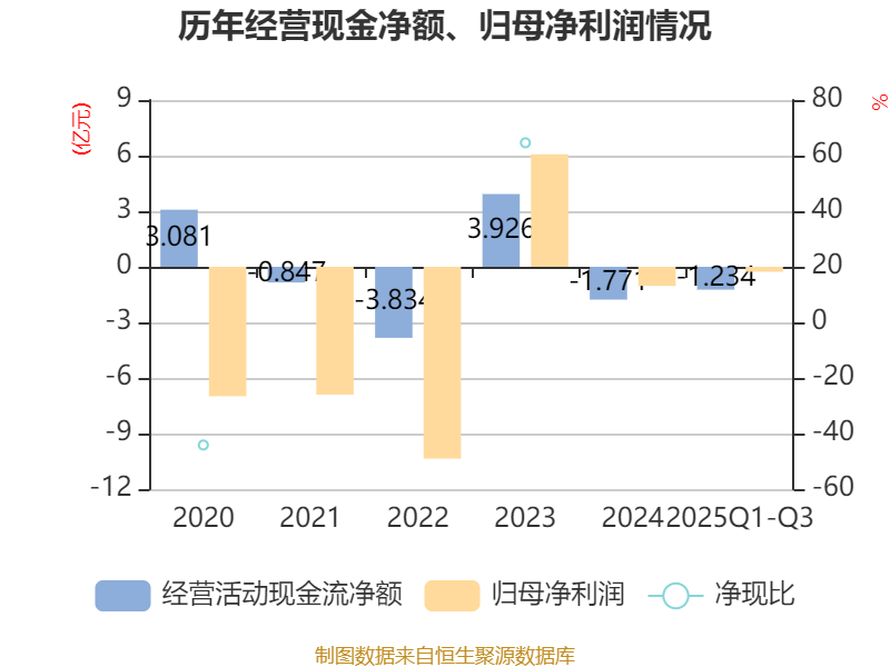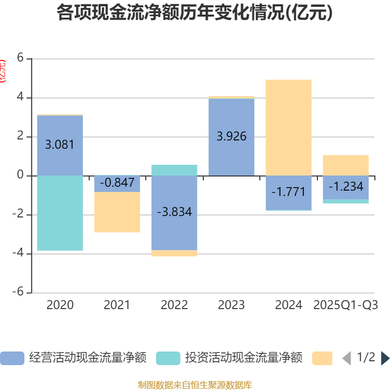 2025年前三季度,公司经营活动现金流净额为-1.23亿元,同比减少4584.21万元;筹资活动现金流净额1.05亿元,同比减少3.82亿元;投资活动现金流净额-1982.3万元,上年同期为-5224.85万元。