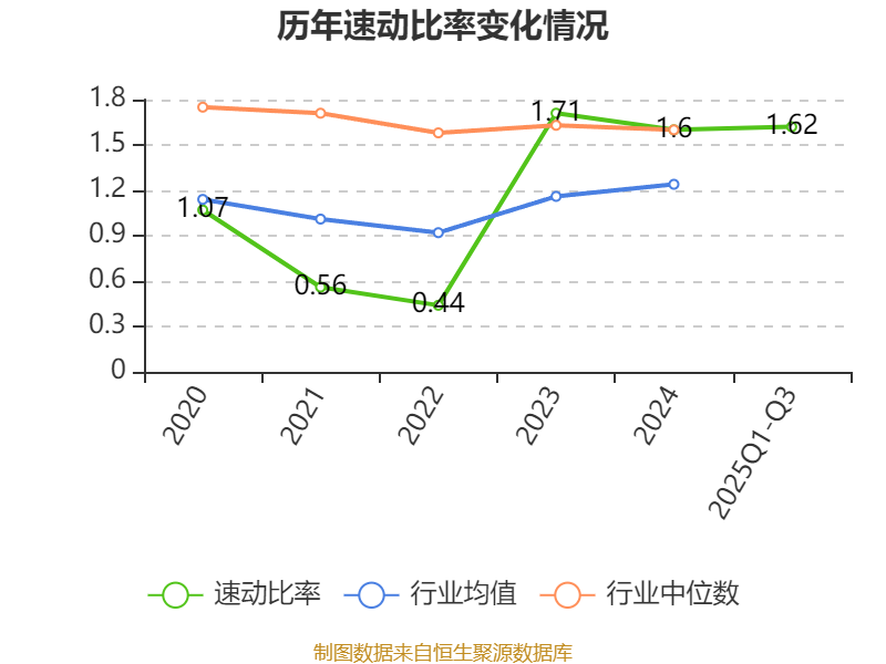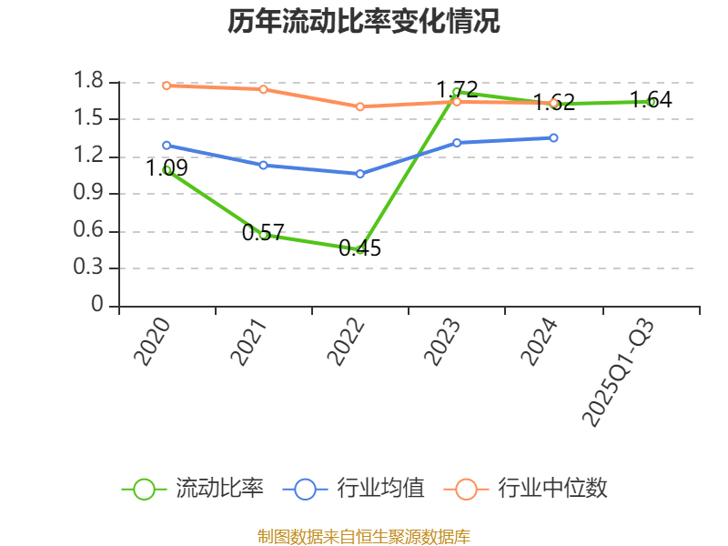 2025年前三季度,公司流动比率为1.64,速动比率为1.62。