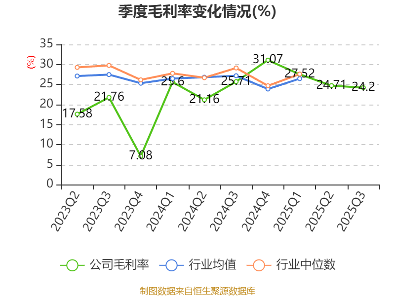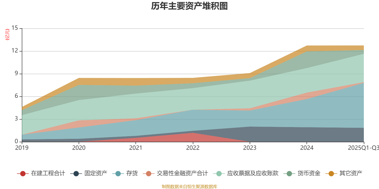 资产重大变化方面,截至2025年三季度末,公司存货较上年末增加59.37%,占公司总资产比重上升17.37个百分点;货币资金较上年末减少76.9%,占公司总资产比重下降13.38个百分点;交易性金融资产合计较上年末减少88.3%,占公司总资产比重下降5.93个百分点;应收票据及应收账款较上年末增加15.42%,占公司总资产比重上升3.91个百分点。