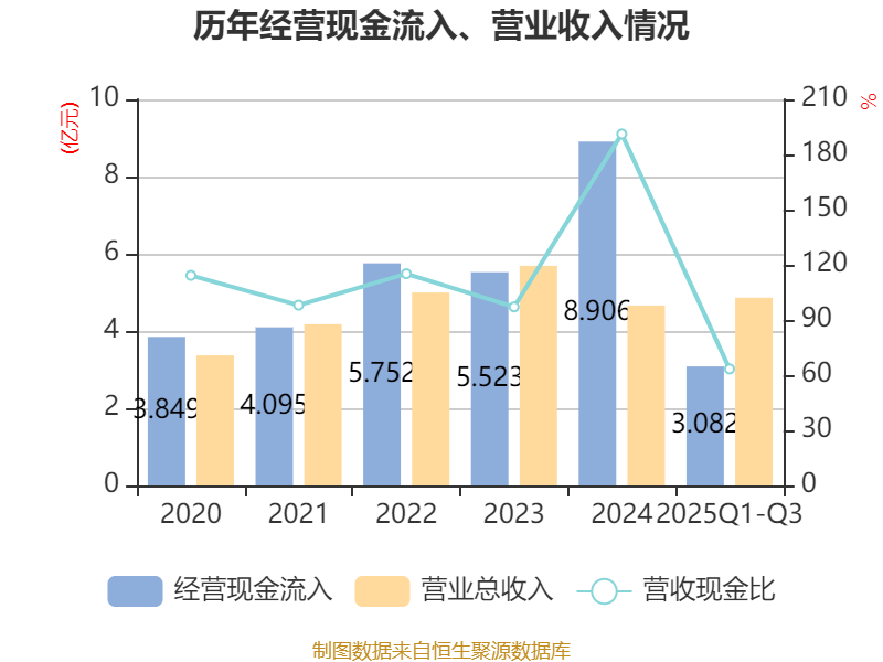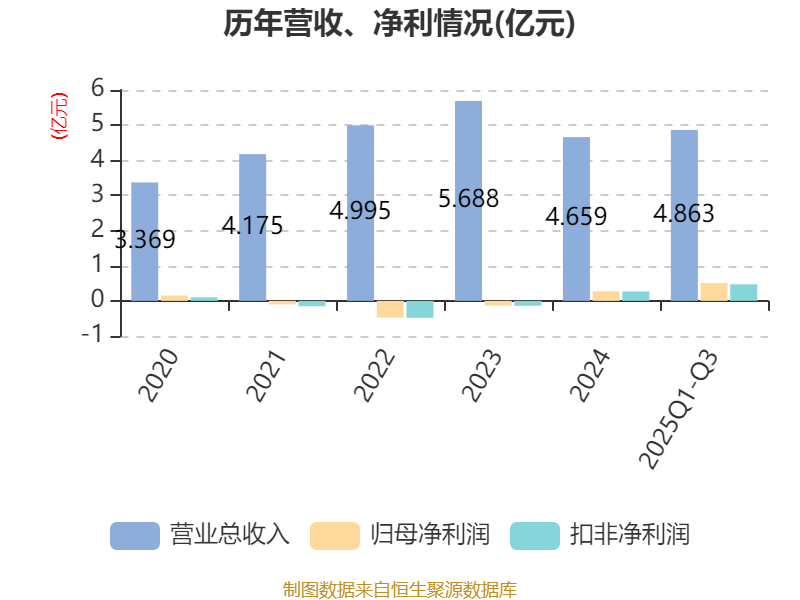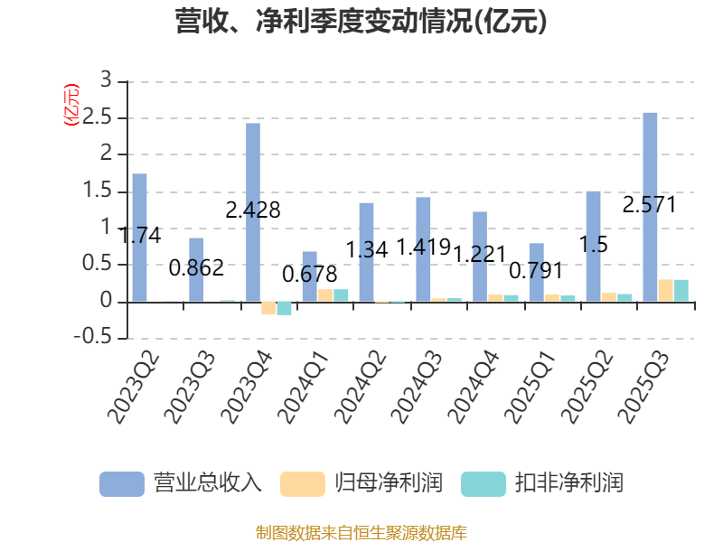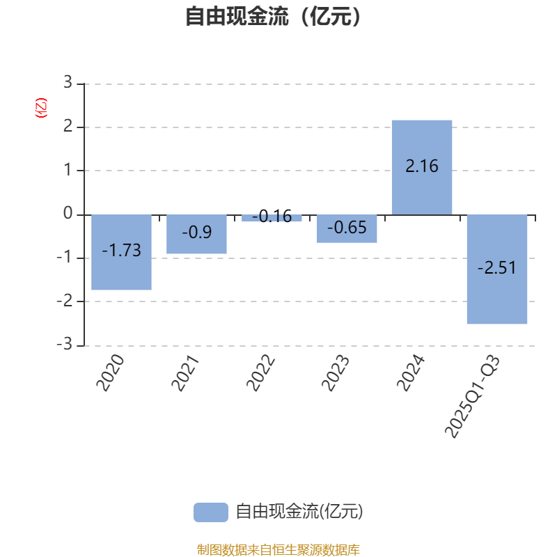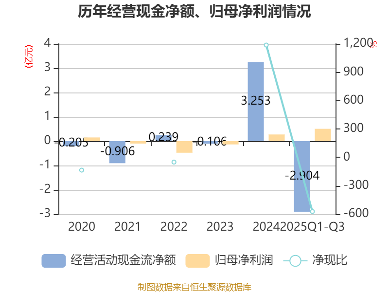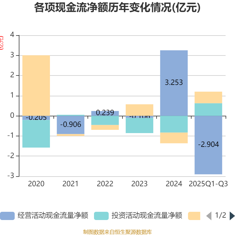 2025年前三季度,公司经营活动现金流净额为-2.9亿元,同比减少4.12亿元;筹资活动现金流净额5743.38万元,同比增加9344.48万元;投资活动现金流净额6255.02万元,上年同期为-6136万元。