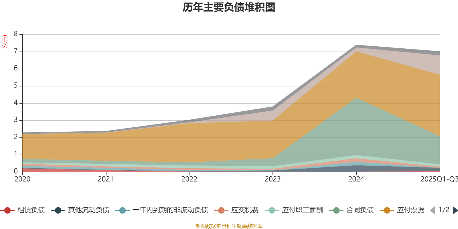 负债重大变化方面,截至2025年三季度末,公司合同负债较上年末减少50.7%,占公司总资产比重下降13.29个百分点;应付票据及应付账款较上年末增加32.98%,占公司总资产比重上升6.96个百分点;短期借款较上年末增加377.35%,占公司总资产比重上升6.94个百分点;一年内到期的非流动负债较上年末减少100%,占公司总资产比重下降1.57个百分点。