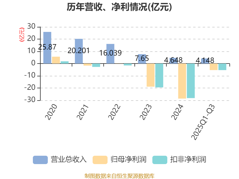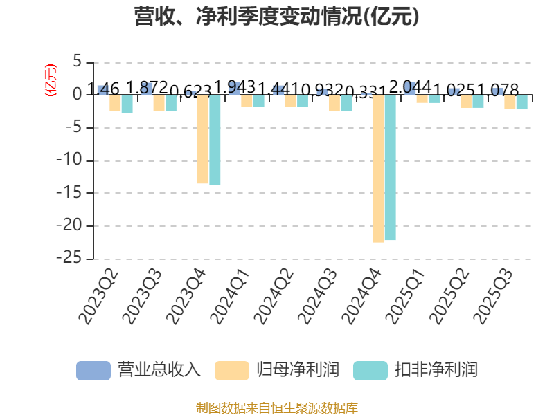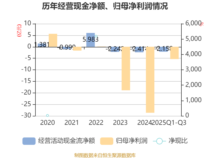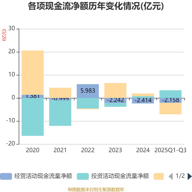 2025年前三季度,公司经营活动现金流净额为-2.16亿元,同比增加1.1亿元;筹资活动现金流净额-4.94亿元,同比减少6.63亿元;投资活动现金流净额3.32亿元,上年同期为-1.67亿元。