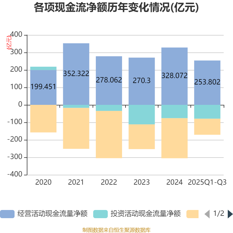2025年前三季度,公司经营活动现金流净额为253.8亿元,同比增长7.48%;筹资活动现金流净额-91.65亿元,同比增加100.96亿元;投资活动现金流净额-79.46亿元,上年同期为-11.56亿元。