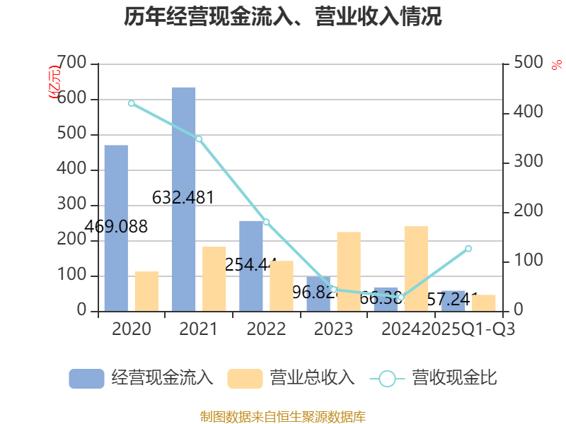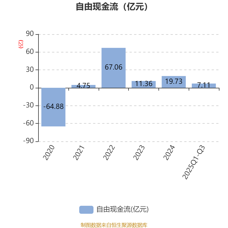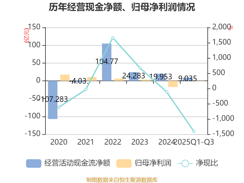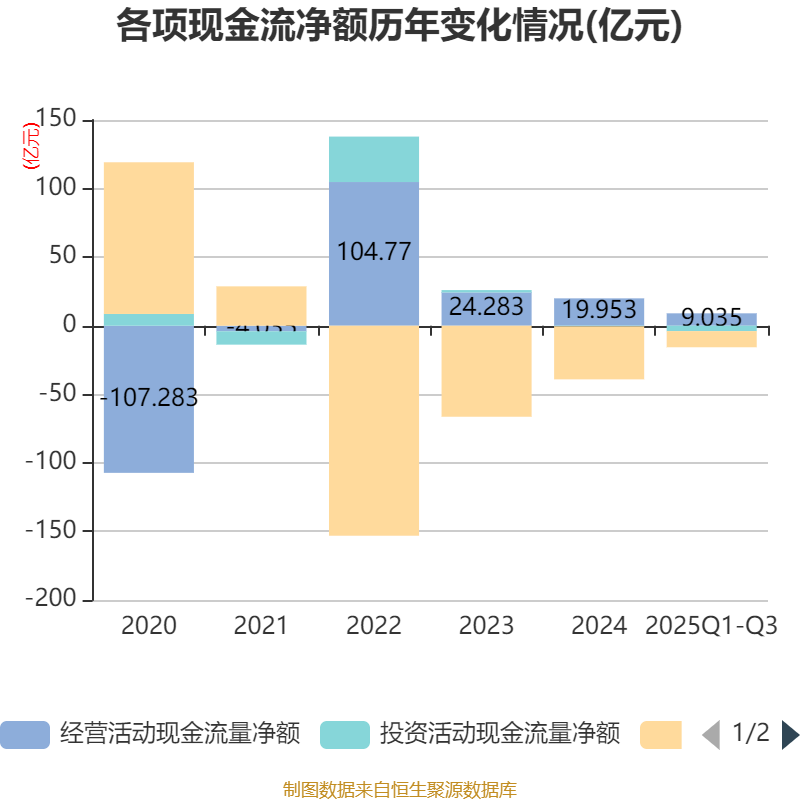 2025年前三季度,公司经营活动现金流净额为9.04亿元,同比下降30.97%;筹资活动现金流净额-11.78亿元,同比增加19.31亿元;投资活动现金流净额-3.94亿元,上年同期为435.36万元。