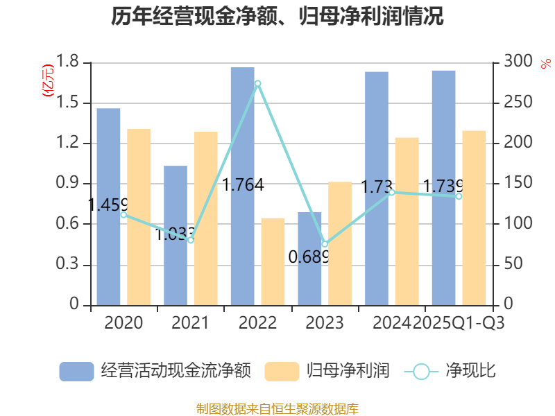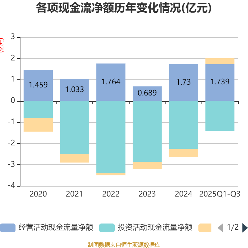 2025年前三季度,公司经营活动现金流净额为1.74亿元,同比增长64.33%;筹资活动现金流净额2739.25万元,同比增加5545.59万元;投资活动现金流净额-1.41亿元,上年同期为-2.13亿元。