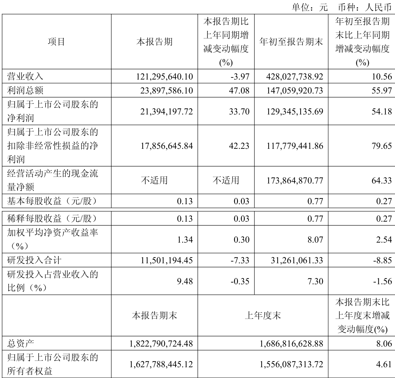 中证智能财讯嘉必优(688089)10月28日披露2025年第三季度报告。前三季度公司实现营业总收入4.28亿元,同比增长10.56%;归母净利润1.29亿元,同比增长54.18%;扣非净利润1.18亿元,同比增长79.65%;经营活动产生的现金流量净额为1.74亿元,同比增长64.33%;报告期内,嘉必优基本每股收益为0.77元,加权平均净资产收益率为8.07%。
