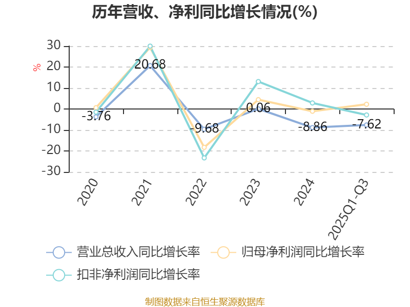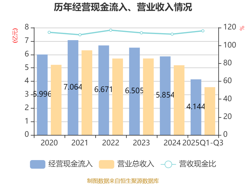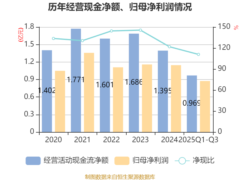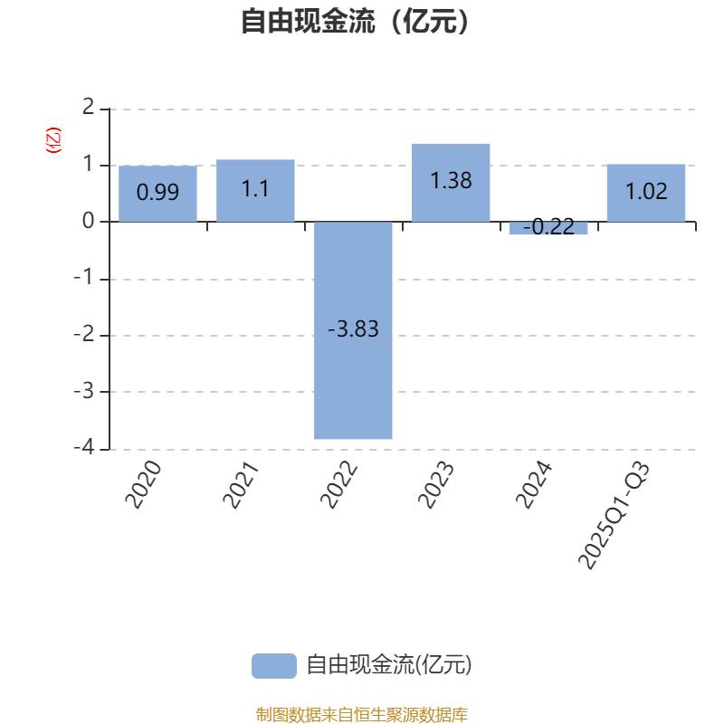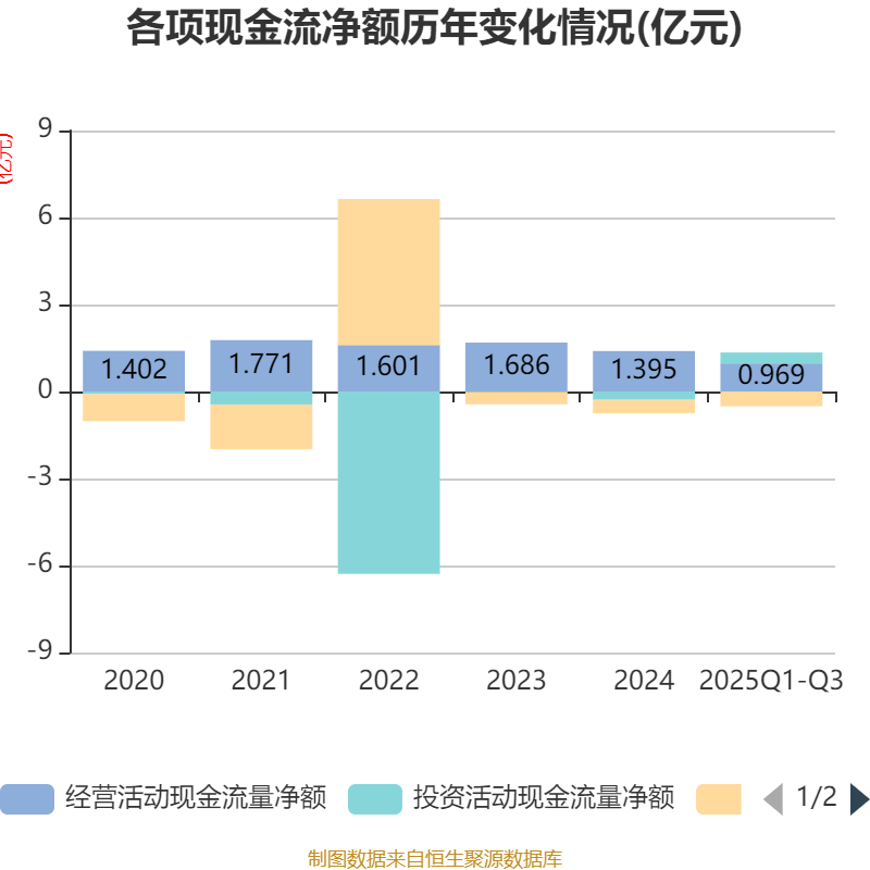 2025年前三季度,公司经营活动现金流净额为9689.78万元,同比增长15.5%;筹资活动现金流净额-5087.88万元,同比减少565.32万元;投资活动现金流净额3755.89万元,上年同期为-1756.27万元。