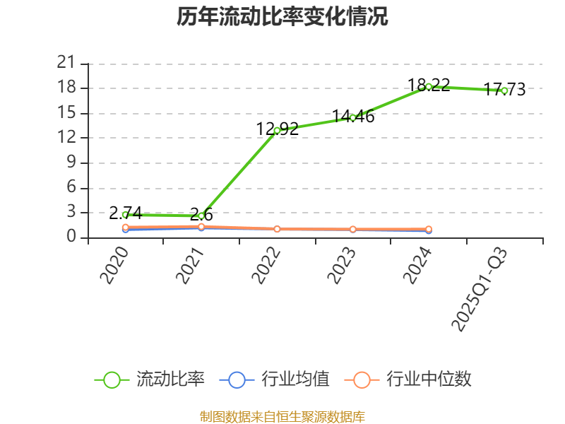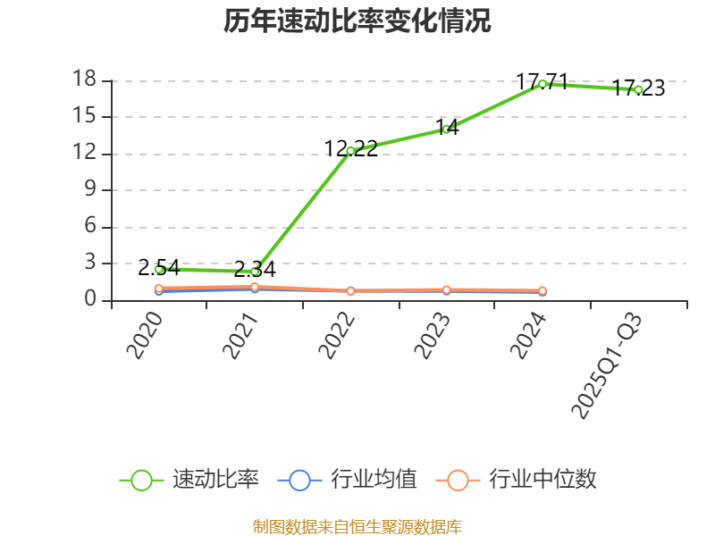 2025年前三季度,公司流动比率为17.73,速动比率为17.23。