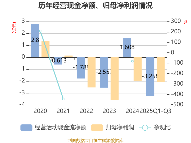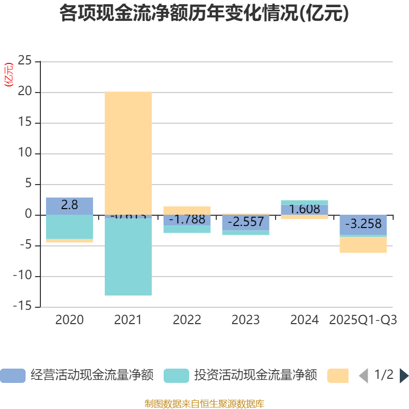 2025年前三季度,公司经营活动现金流净额为-3.26亿元,同比增加7147.67万元;筹资活动现金流净额-2.58亿元,同比减少2.95亿元;投资活动现金流净额-3692.47万元,上年同期为1.49亿元。
