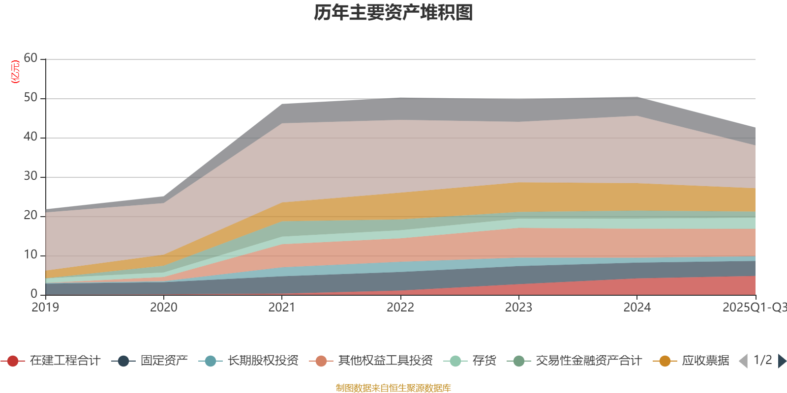 资产重大变化方面,截至2025年三季度末,公司货币资金较上年末减少36.33%,占公司总资产比重下降8.37个百分点;在建工程合计较上年末增加14.67%,占公司总资产比重上升2.97个百分点;其他权益工具投资较上年末减少5.79%,占公司总资产比重上升1.7个百分点;存货较上年末增加10.25%,占公司总资产比重上升1.56个百分点。