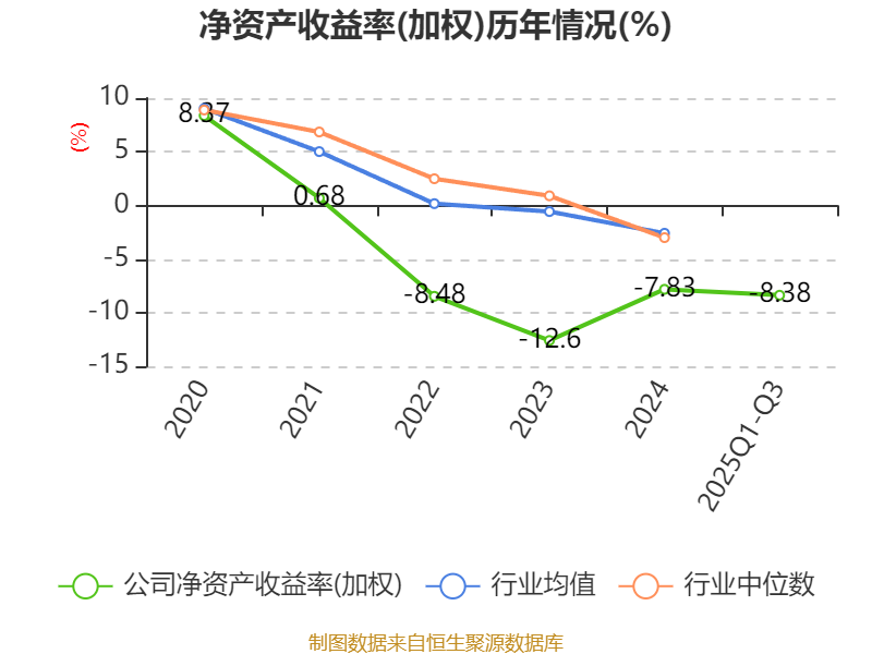 盈利能力方面, 2025年前三季度公司加权平均净资产收益率为-8.38%,同比上升5.38个百分点。公司2025年前三季度投入资本回报率为-5.25%,较上年同期上升3.01个百分点。