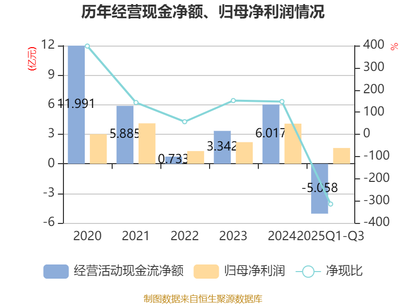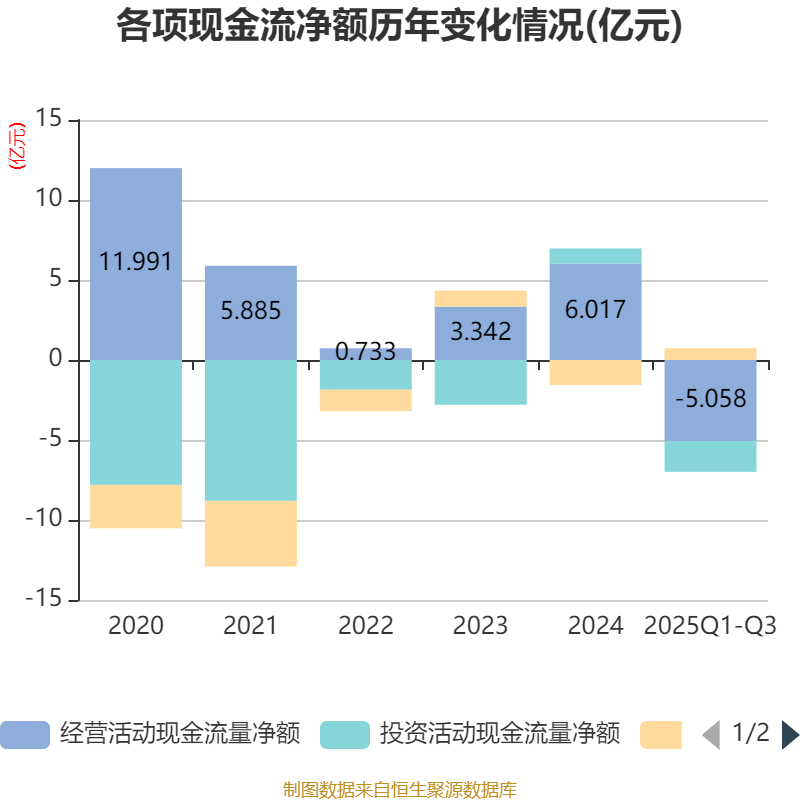 2025年前三季度,公司经营活动现金流净额为-5.06亿元,同比减少5.38亿元;筹资活动现金流净额7358.36万元,同比增加3.5亿元;投资活动现金流净额-1.93亿元,上年同期为2.54亿元。