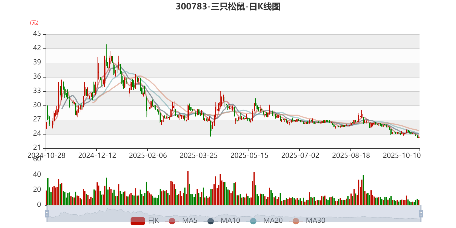 以10月27日收盘价计算,三只松鼠目前市盈率(TTM)约为41.3倍,市净率(LF)约3.16倍,市销率(TTM)约0.84倍。
