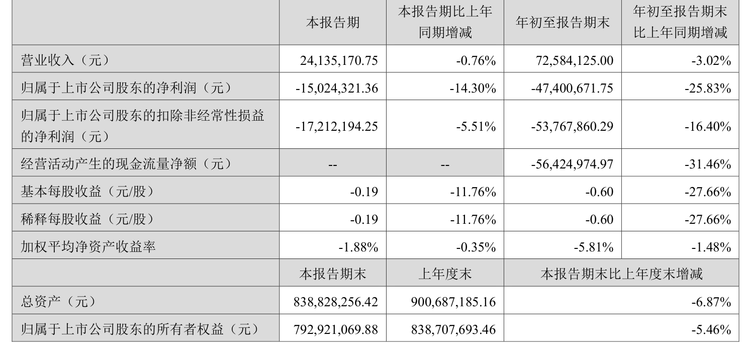 中证智能财讯盈建科(300935)10月28日披露2025年第三季度报告。前三季度公司实现营业总收入7258.41万元,同比下降3.02%;归母净利润亏损4740.07万元,上年同期亏损3766.97万元;扣非净利润亏损5376.79万元,上年同期亏损4619.42万元;经营活动产生的现金流量净额为-5642.5万元,上年同期为-4292.24万元;报告期内,盈建科基本每股收益为-0.6元,加权平均净资产收益率为-5.81%。