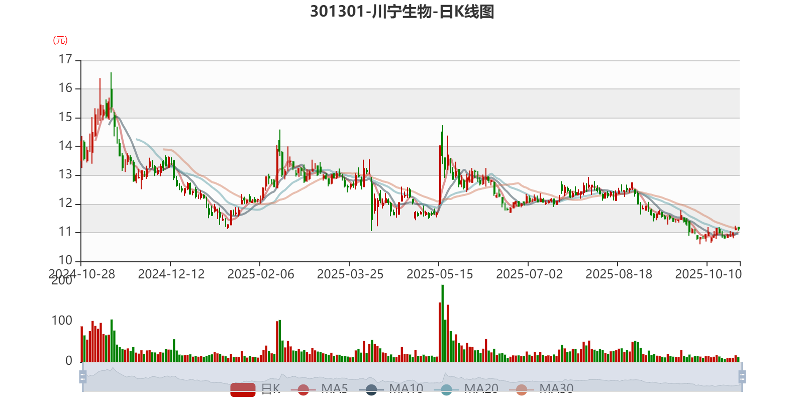 中证智能财讯川宁生物(301301)10月28日披露2025年第三季度报告。前三季度公司实现营业总收入34.36亿元,同比下降22.90%;归母净利润6.11亿元,同比下降43.17%;扣非净利润6.08亿元,同比下降43.44%;经营活动产生的现金流量净额为5.71亿元,同比下降34.77%;报告期内,川宁生物基本每股收益为0.27元,加权平均净资产收益率为7.63%。