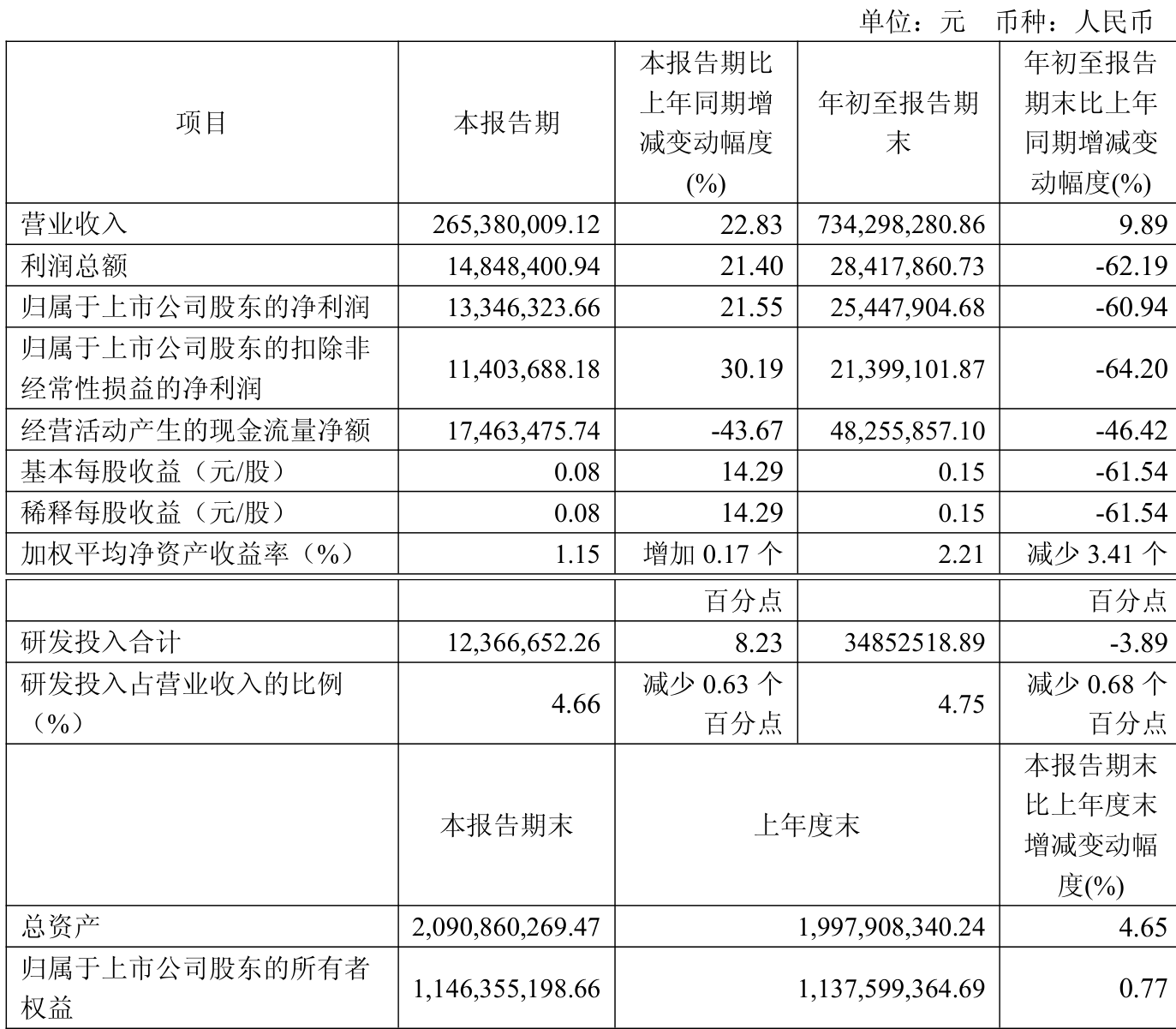 中证智能财讯赛特新材(688398)10月28日披露2025年第三季度报告。前三季度公司实现营业总收入7.34亿元,同比增长9.89%;归母净利润2544.79万元,同比下降60.94%;扣非净利润2139.91万元,同比下降64.20%;经营活动产生的现金流量净额为4825.59万元,同比下降46.42%;报告期内,赛特新材基本每股收益为0.15元,加权平均净资产收益率为2.21%。