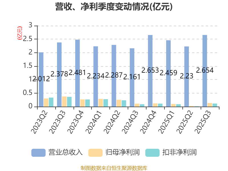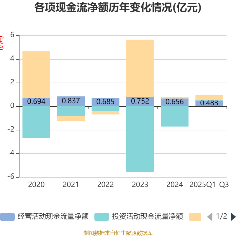 2025年前三季度,公司经营活动现金流净额为4825.59万元,同比下降46.42%;筹资活动现金流净额4269.85万元,同比增加3511.24万元;投资活动现金流净额657.61万元,上年同期为-1043.48万元。