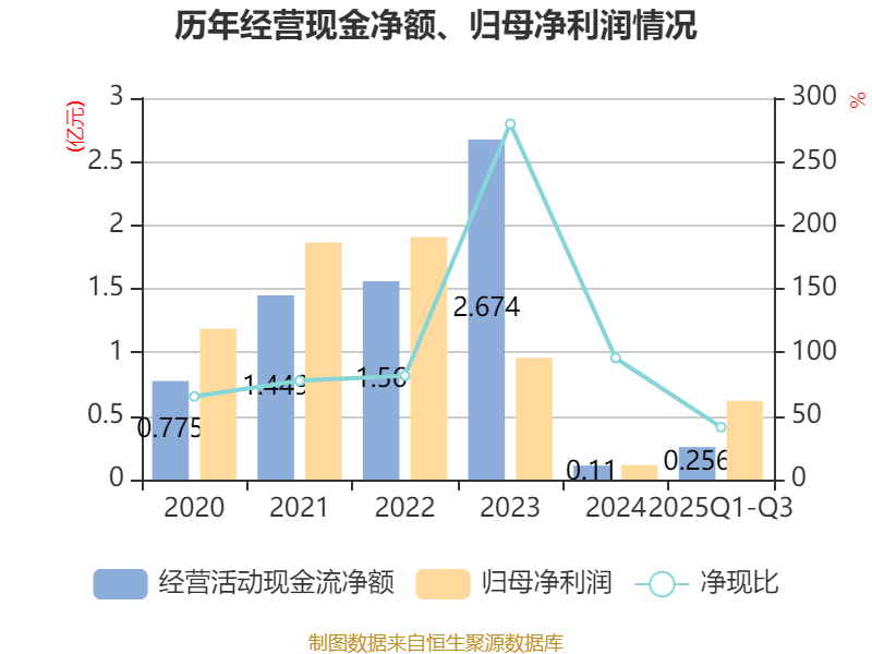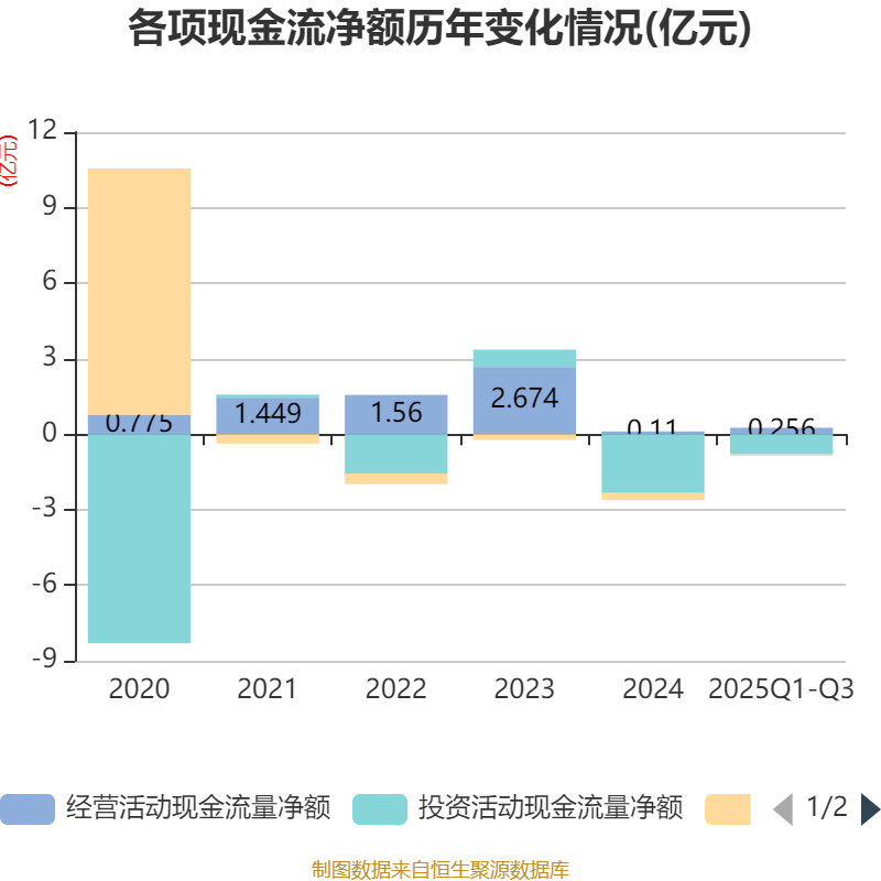 2025年前三季度,公司经营活动现金流净额为2557.9万元,同比增长361.91%;筹资活动现金流净额-545.58万元,同比增加3259.54万元;投资活动现金流净额-8039.25万元,上年同期为-1.85亿元。