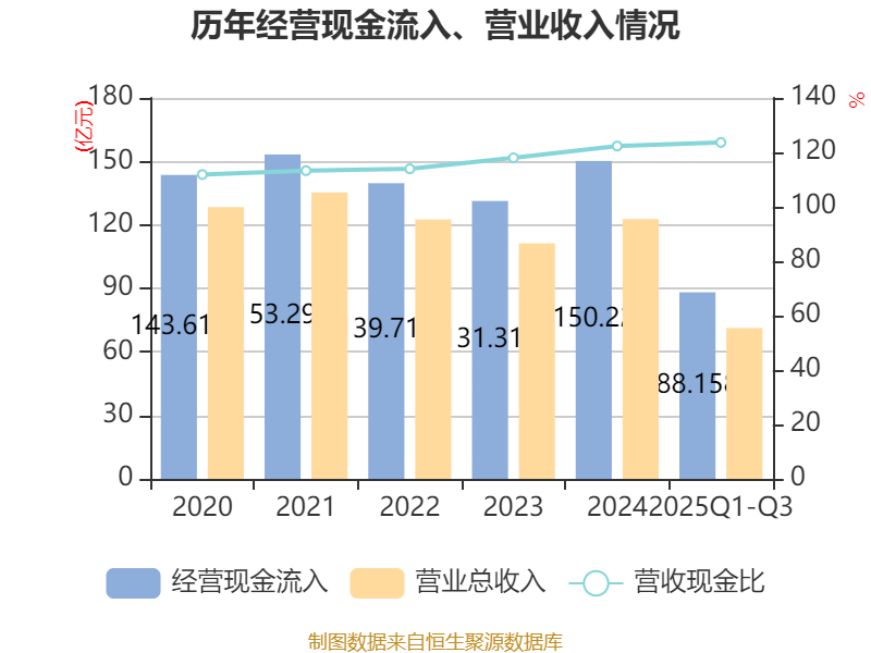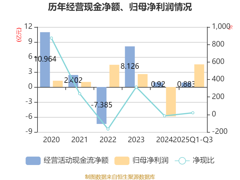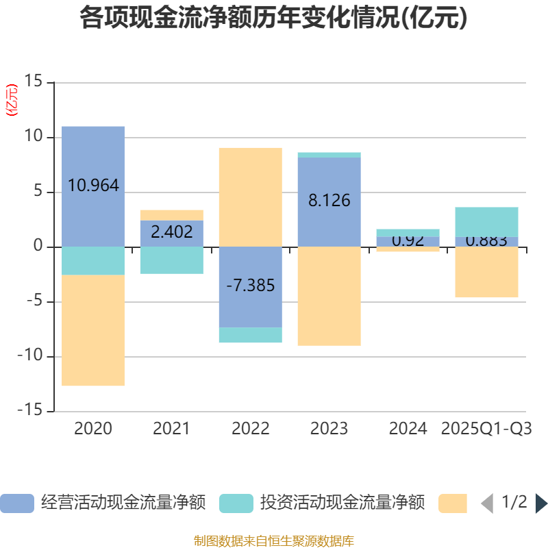 2025年前三季度,公司经营活动现金流净额为8827.3万元,同比下降1.5%;筹资活动现金流净额-4.63亿元,同比减少1.18亿元;投资活动现金流净额2.71亿元,上年同期为2.72亿元。