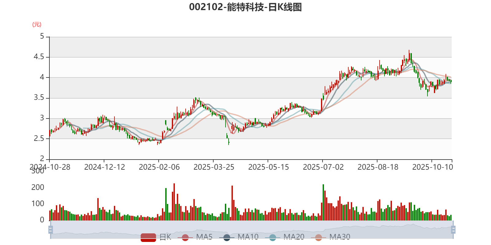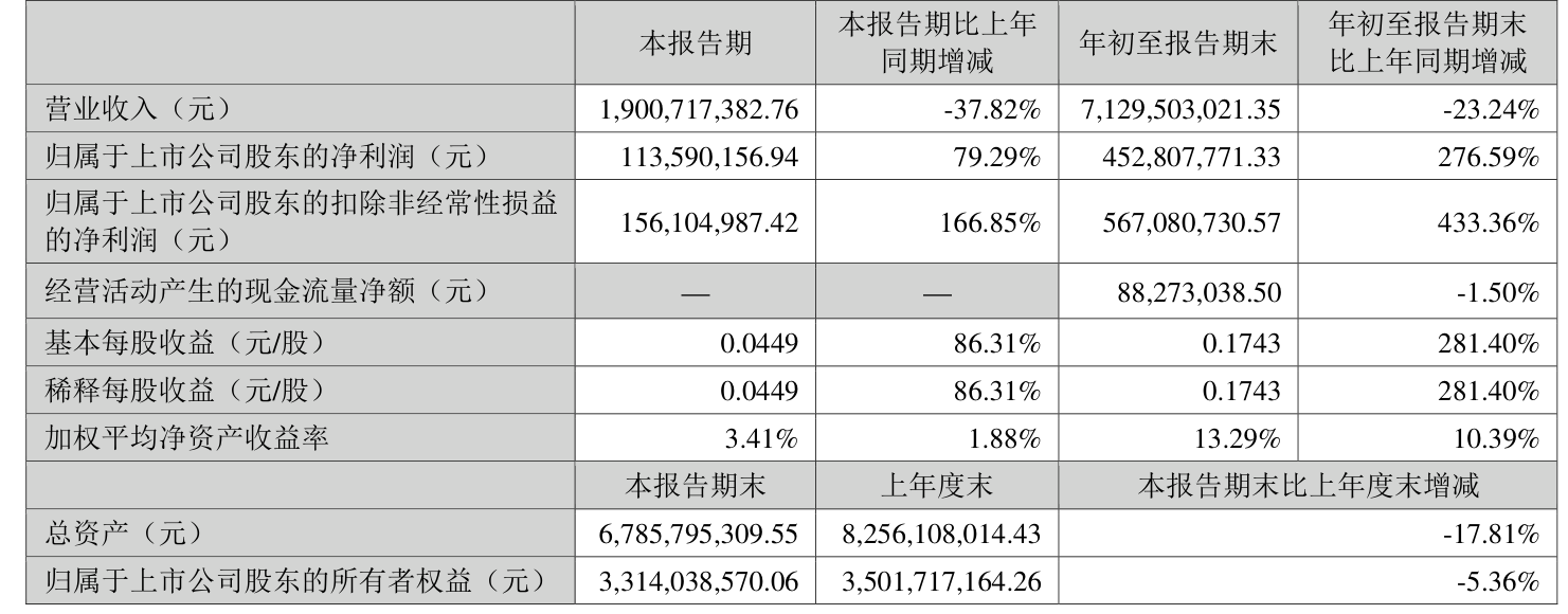 中证智能财讯能特科技(002102)10月28日披露2025年第三季度报告。前三季度公司实现营业总收入71.3亿元,同比下降23.24%;归母净利润4.53亿元,同比增长276.59%;扣非净利润5.67亿元,同比增长433.36%;经营活动产生的现金流量净额为8827.3万元,同比下降1.50%;报告期内,能特科技基本每股收益为0.1743元,加权平均净资产收益率为13.29%。