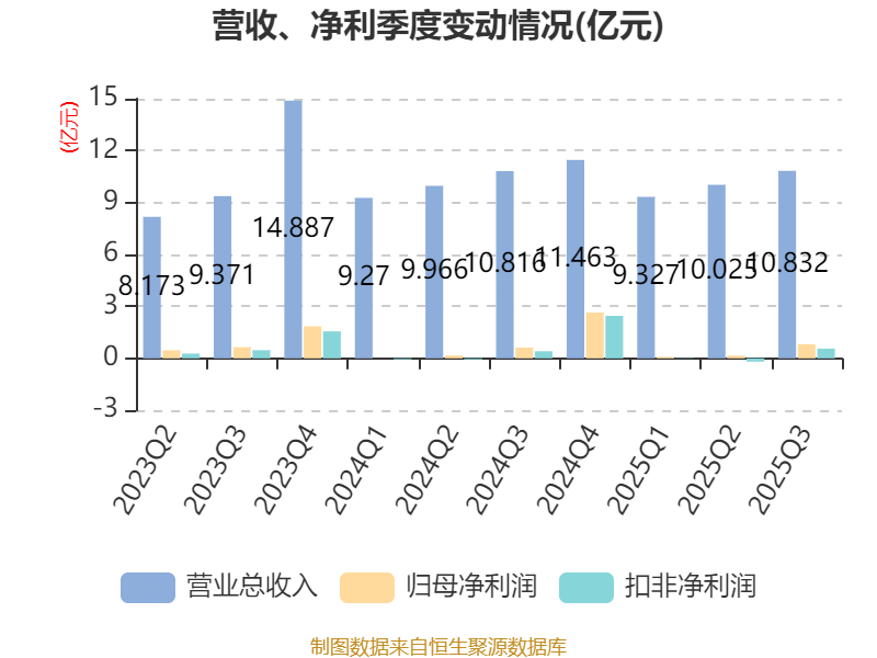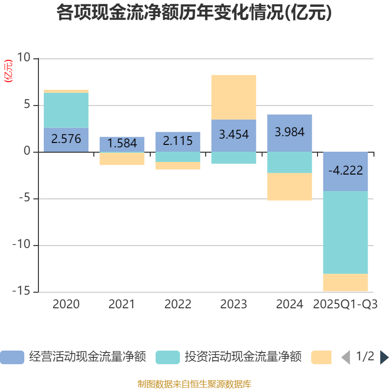 2025年前三季度,公司经营活动现金流净额为-4.22亿元,同比增加2620.01万元;筹资活动现金流净额-1.85亿元,同比增加1.23亿元;投资活动现金流净额-8.86亿元,上年同期为-5.66亿元。