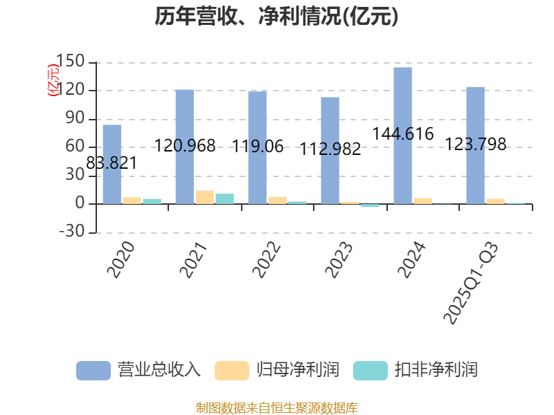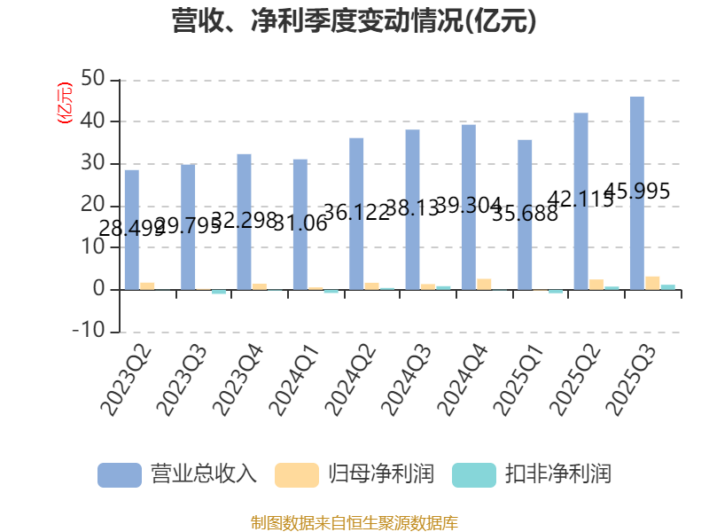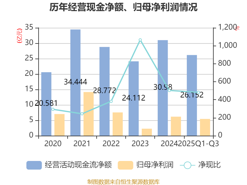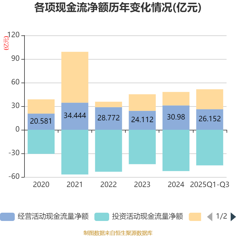 2025年前三季度,公司经营活动现金流净额为26.15亿元,同比增长32.26%;筹资活动现金流净额25.39亿元,同比减少3亿元;投资活动现金流净额-45.22亿元,上年同期为-42.97亿元。