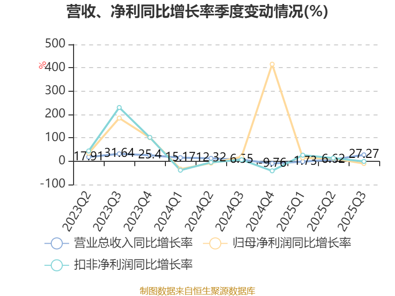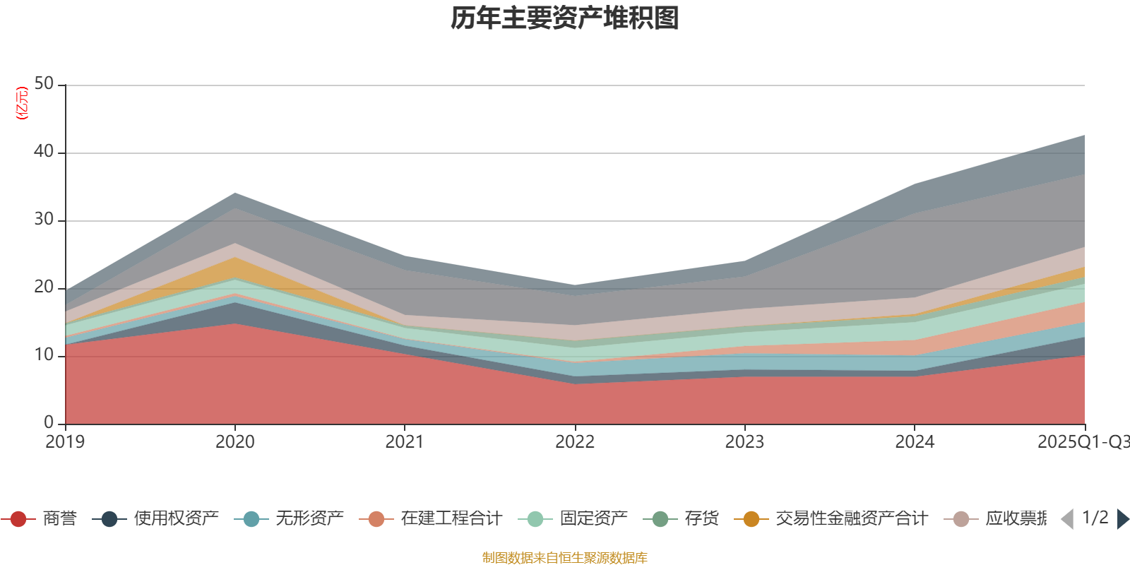 资产重大变化方面,截至2025年三季度末,公司货币资金较上年末减少13.56%,占公司总资产比重下降9.88个百分点;商誉较上年末增加45.91%,占公司总资产比重上升4.16个百分点;使用权资产较上年末增加203.82%,占公司总资产比重上升3.8个百分点;交易性金融资产合计较上年末增加400%,占公司总资产比重上升2.68个百分点。