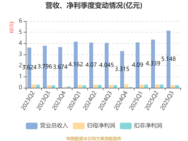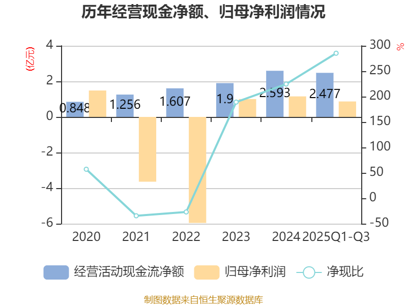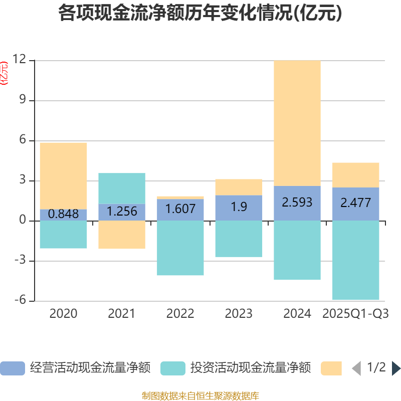 2025年前三季度,公司经营活动现金流净额为2.48亿元,同比增长0.33%;筹资活动现金流净额1.85亿元,同比增加1.26亿元;投资活动现金流净额-5.93亿元,上年同期为-4.24亿元。