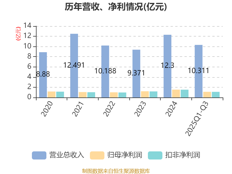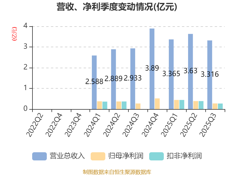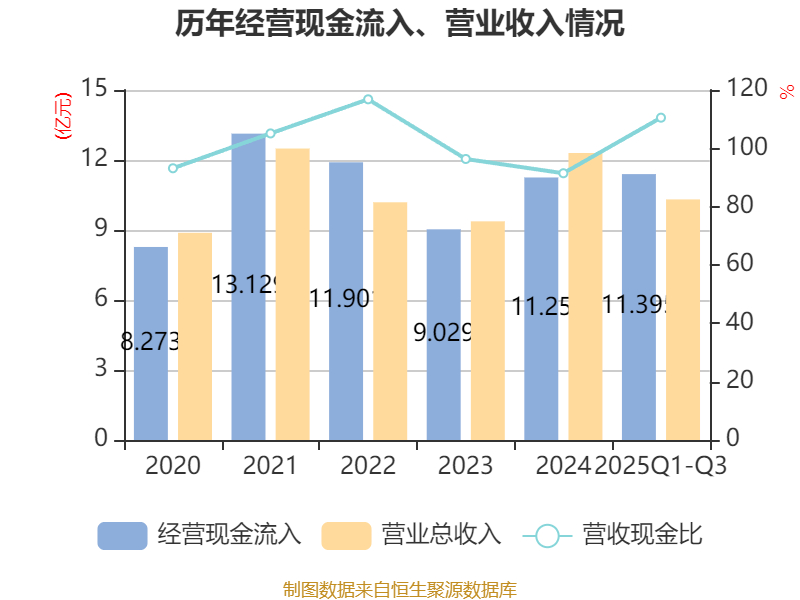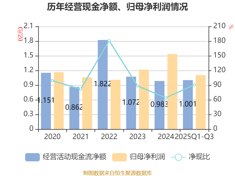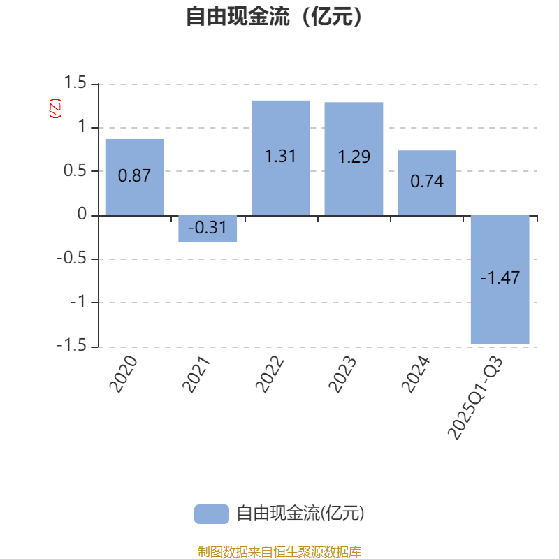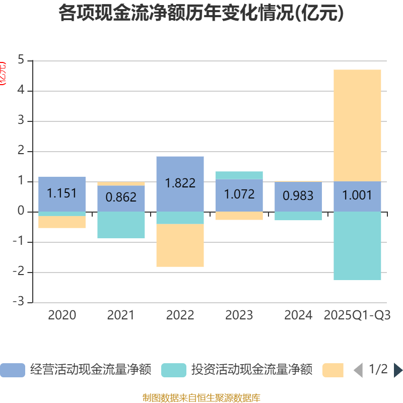 2025年前三季度,公司经营活动现金流净额为1亿元,同比增长89.49%;筹资活动现金流净额3.69亿元,同比增加3.63亿元;投资活动现金流净额-2.27亿元,上年同期为-2691.8万元。