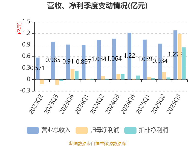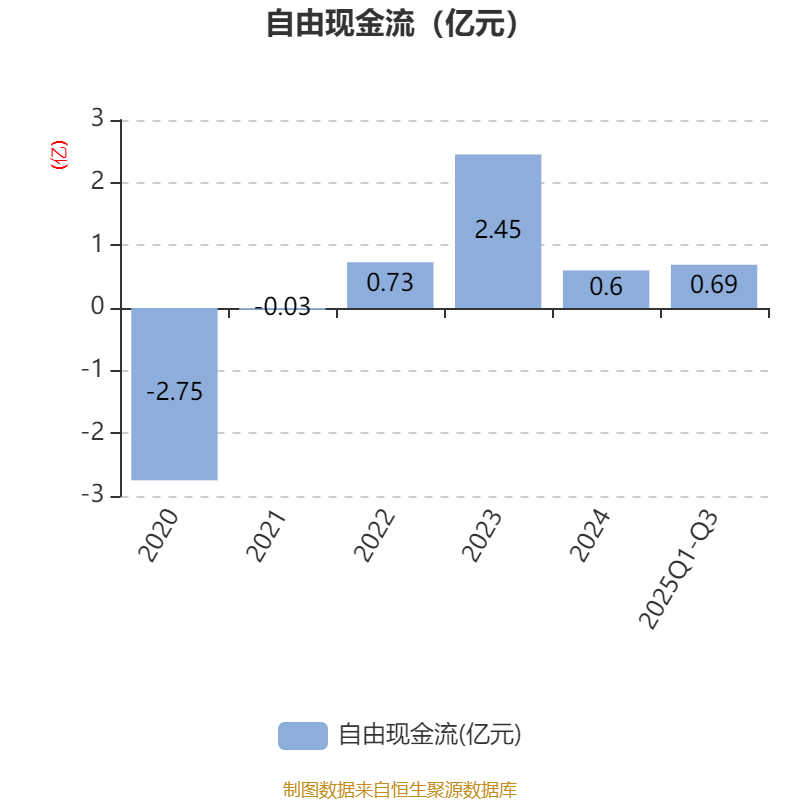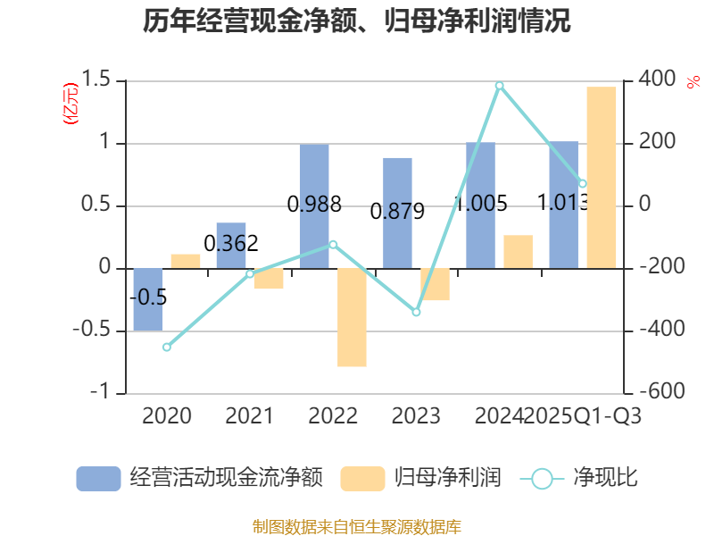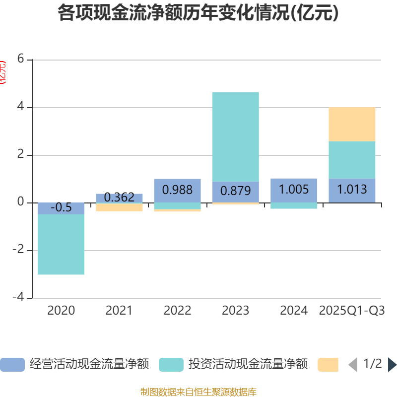 2025年前三季度,公司经营活动现金流净额为1.01亿元,同比增长34.4%;筹资活动现金流净额1.42亿元,同比增加1.42亿元;投资活动现金流净额1.56亿元,上年同期为-1954.05万元。