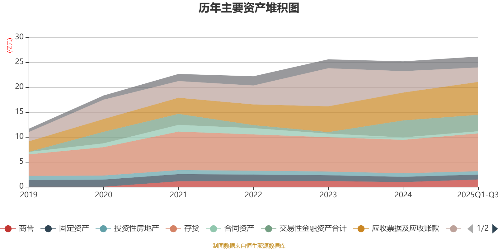 资产重大变化方面,截至2025年三季度末,公司货币资金较上年末减少32.21%,占公司总资产比重下降5.93个百分点;应收票据及应收账款较上年末增加17.72%,占公司总资产比重上升2.99个百分点;存货较上年末增加13.12%,占公司总资产比重上升2.4个百分点;商誉较上年末增加54.61%,占公司总资产比重上升1.82个百分点。
