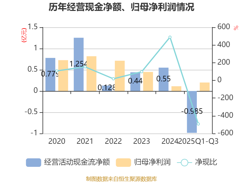 2025年前三季度,公司经营活动现金流净额为-9852.27万元,同比减少3470.95万元;筹资活动现金流净额-405.4万元,同比增加2897.38万元;投资活动现金流净额-3312.37万元,上年同期为-3.34亿元。