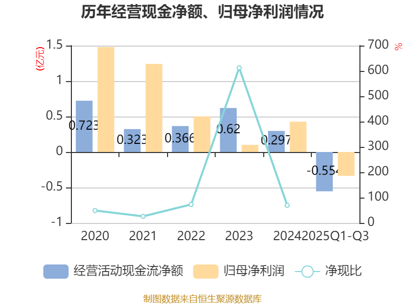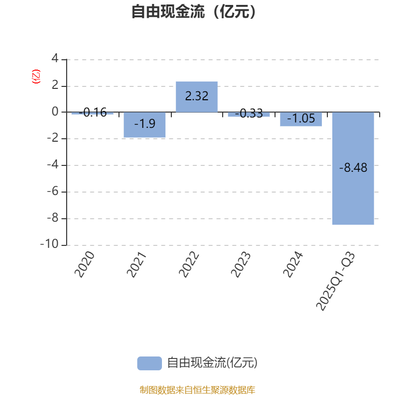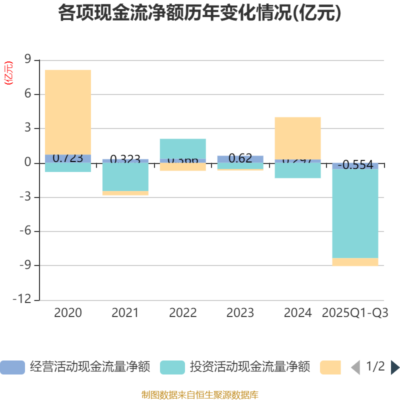 2025年前三季度,公司经营活动现金流净额为-5535.58万元,同比减少3515.41万元;筹资活动现金流净额-6949.7万元,同比减少7166.89万元;投资活动现金流净额-7.78亿元,上年同期为-4.84亿元。