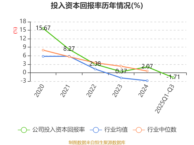 盈利能力方面, 2025年前三季度公司加权平均净资产收益率为-1.82%,同比下降3.44个百分点。公司2025年前三季度投入资本回报率为-1.71%,较上年同期下降2.93个百分点。