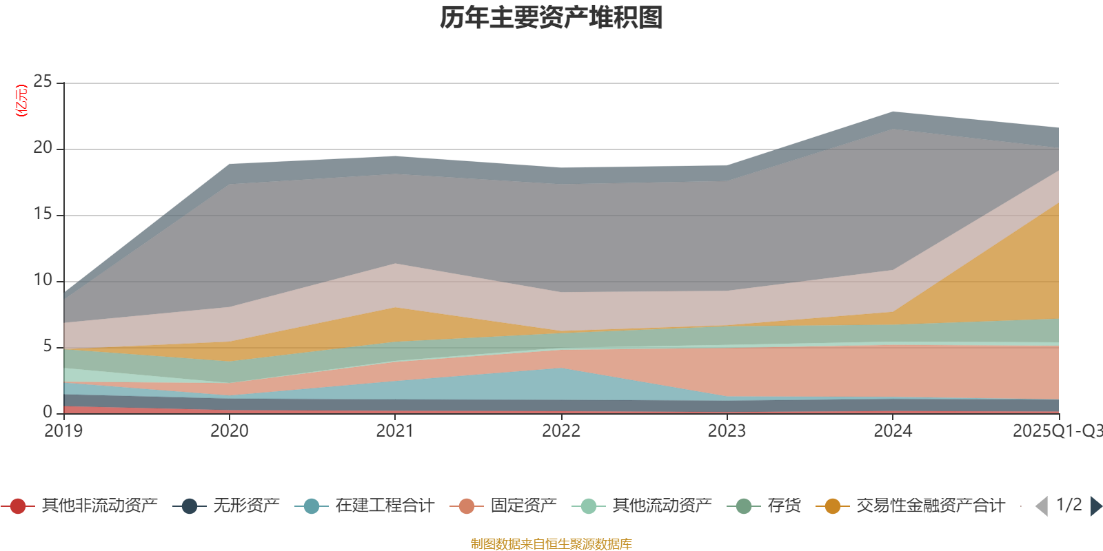 资产重大变化方面,截至2025年三季度末,公司货币资金较上年末减少83.94%,占公司总资产比重下降38.79个百分点;交易性金融资产合计较上年末增加808.83%,占公司总资产比重上升36.38个百分点;存货较上年末增加40.2%,占公司总资产比重上升2.69个百分点;应收票据及应收账款较上年末减少23.33%,占公司总资产比重下降2.64个百分点。
