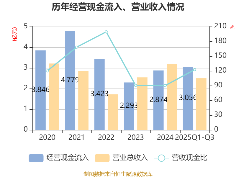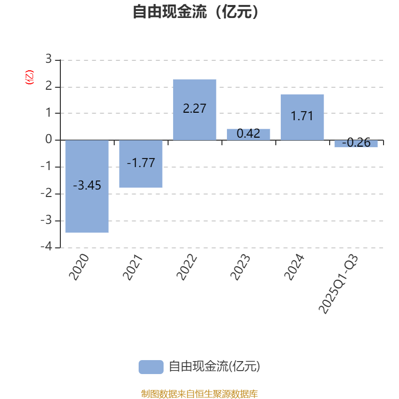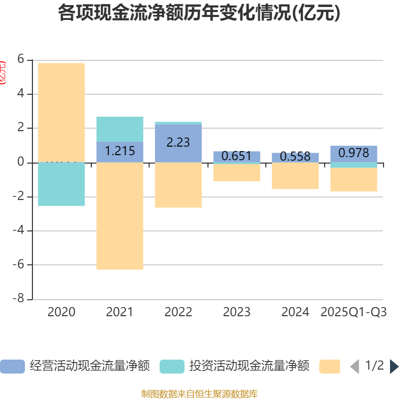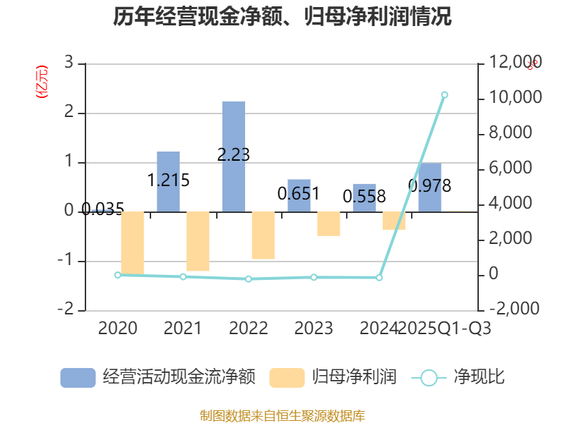2025年前三季度,公司经营活动现金流净额为9776.66万元,同比增长1245.4%;筹资活动现金流净额-1.38亿元,同比减少248.6万元;投资活动现金流净额-3162.93万元,上年同期为-239.07万元。