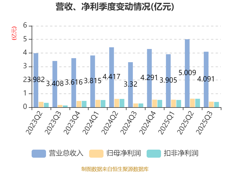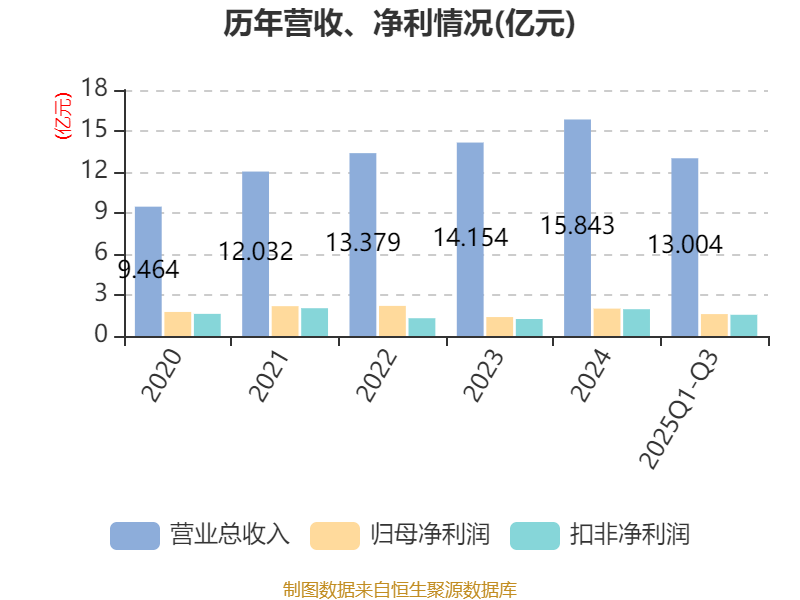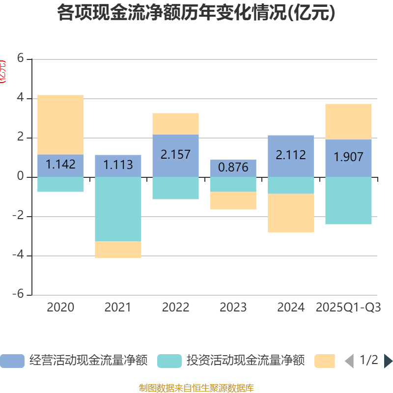 2025年前三季度,公司经营活动现金流净额为1.91亿元,同比增长61.85%;筹资活动现金流净额1.8亿元,同比增加3.34亿元;投资活动现金流净额-2.41亿元,上年同期为-4285.62万元。