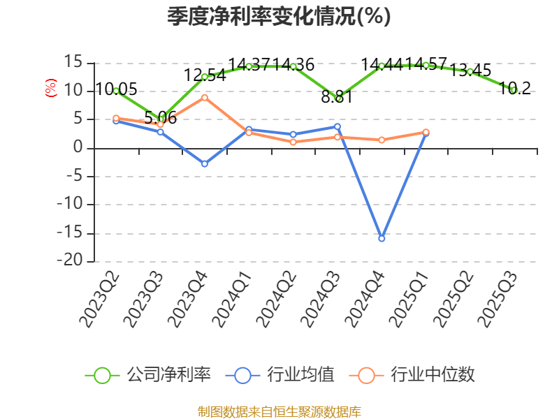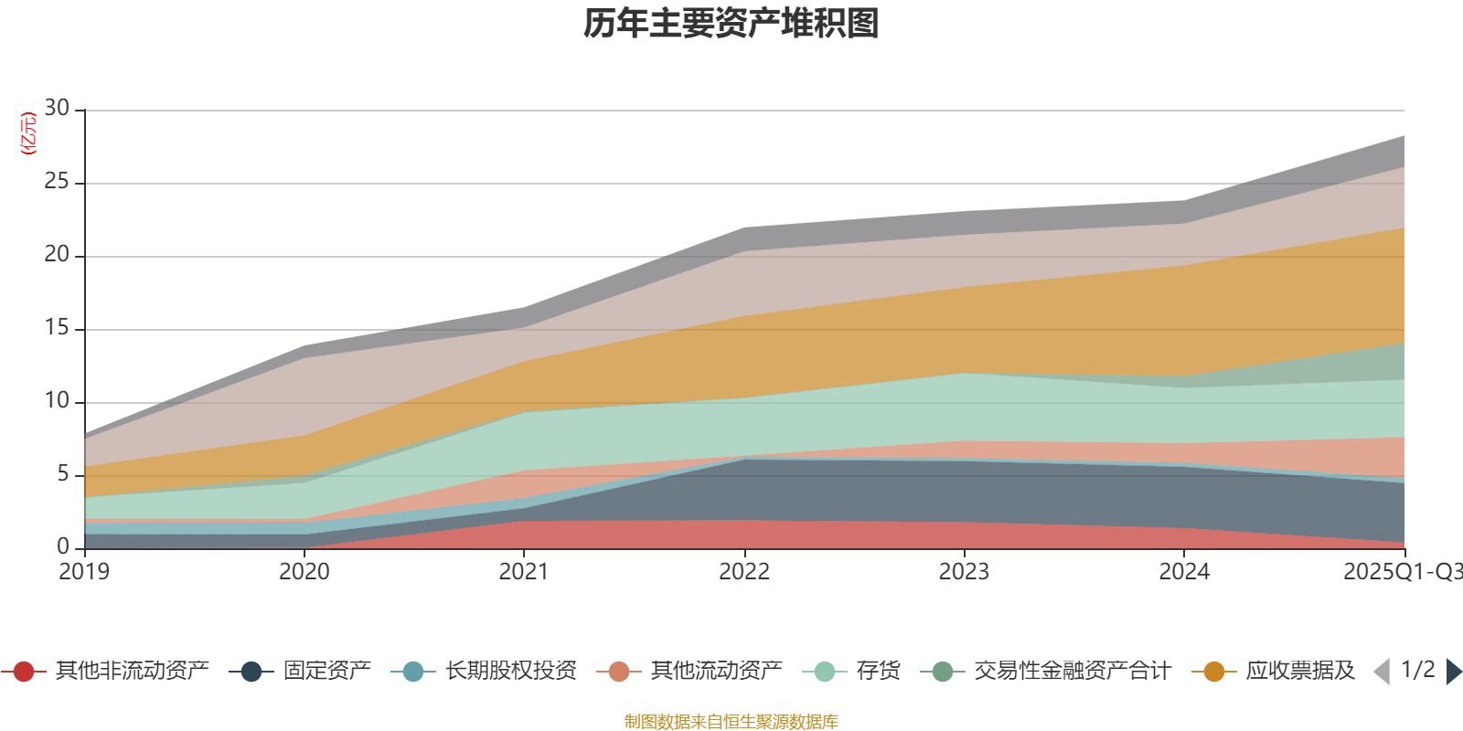 资产重大变化方面,截至2025年三季度末,公司交易性金融资产合计较上年末增加205.39%,占公司总资产比重上升5.44个百分点;其他非流动资产较上年末减少72.02%,占公司总资产比重下降4.43个百分点;其他流动资产较上年末增加106.46%,占公司总资产比重上升4.21个百分点;应收票据及应收账款较上年末增加4.03%,占公司总资产比重下降3.92个百分点。