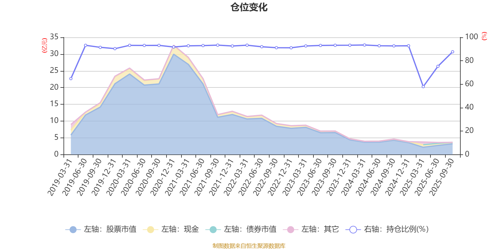 据定期报告数据统计,近三年平均股票仓位为88.01%,同类平均为72.16%。2024年一季度末基金达到93.47%的最高仓位,2025年一季度末最低,为57.95%。