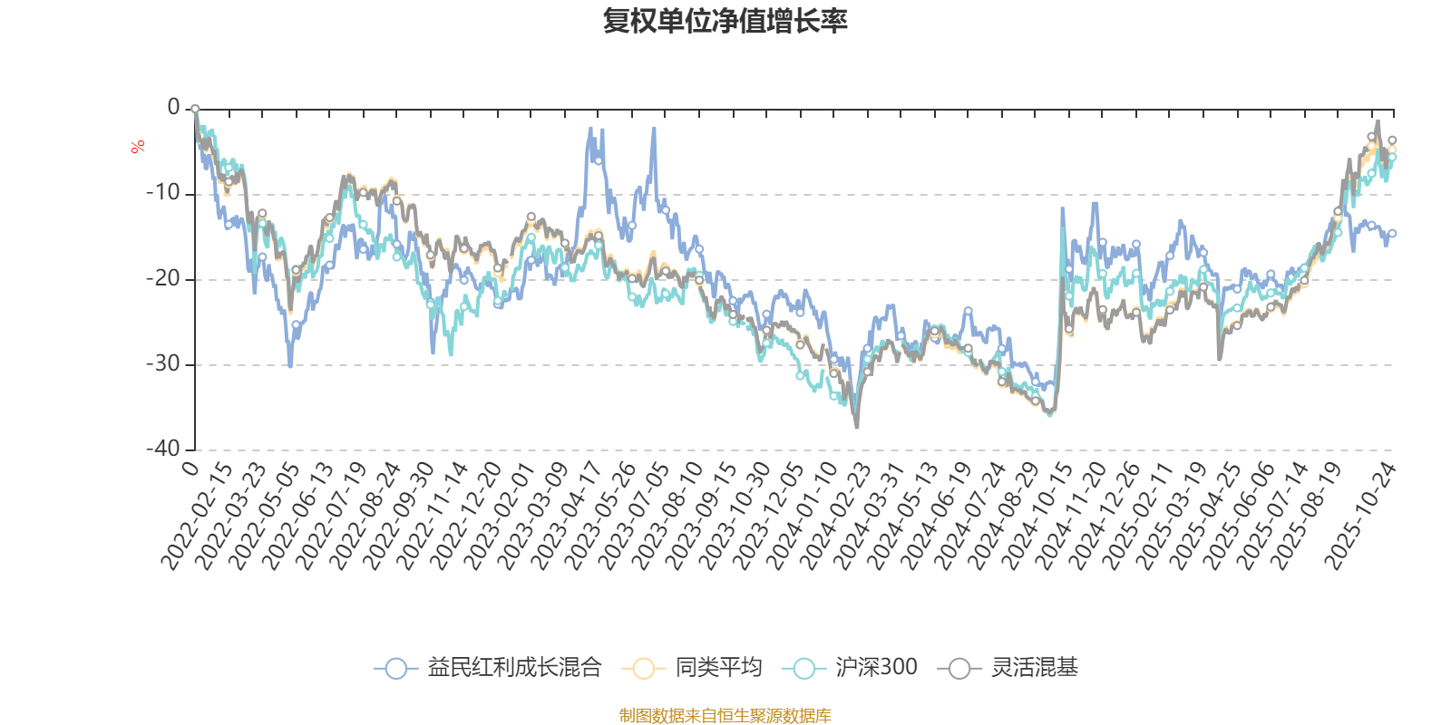 截至10月24日,益民红利成长混合近三个月复权单位净值增长率为1.96%,位于同类可比基金1071/1287;近半年复权单位净值增长率为8.48%,位于同类可比基金1044/1287;近一年复权单位净值增长率为2.48%,位于同类可比基金1209/1287;近三年复权单位净值增长率为8.26%,位于同类可比基金789/1286。