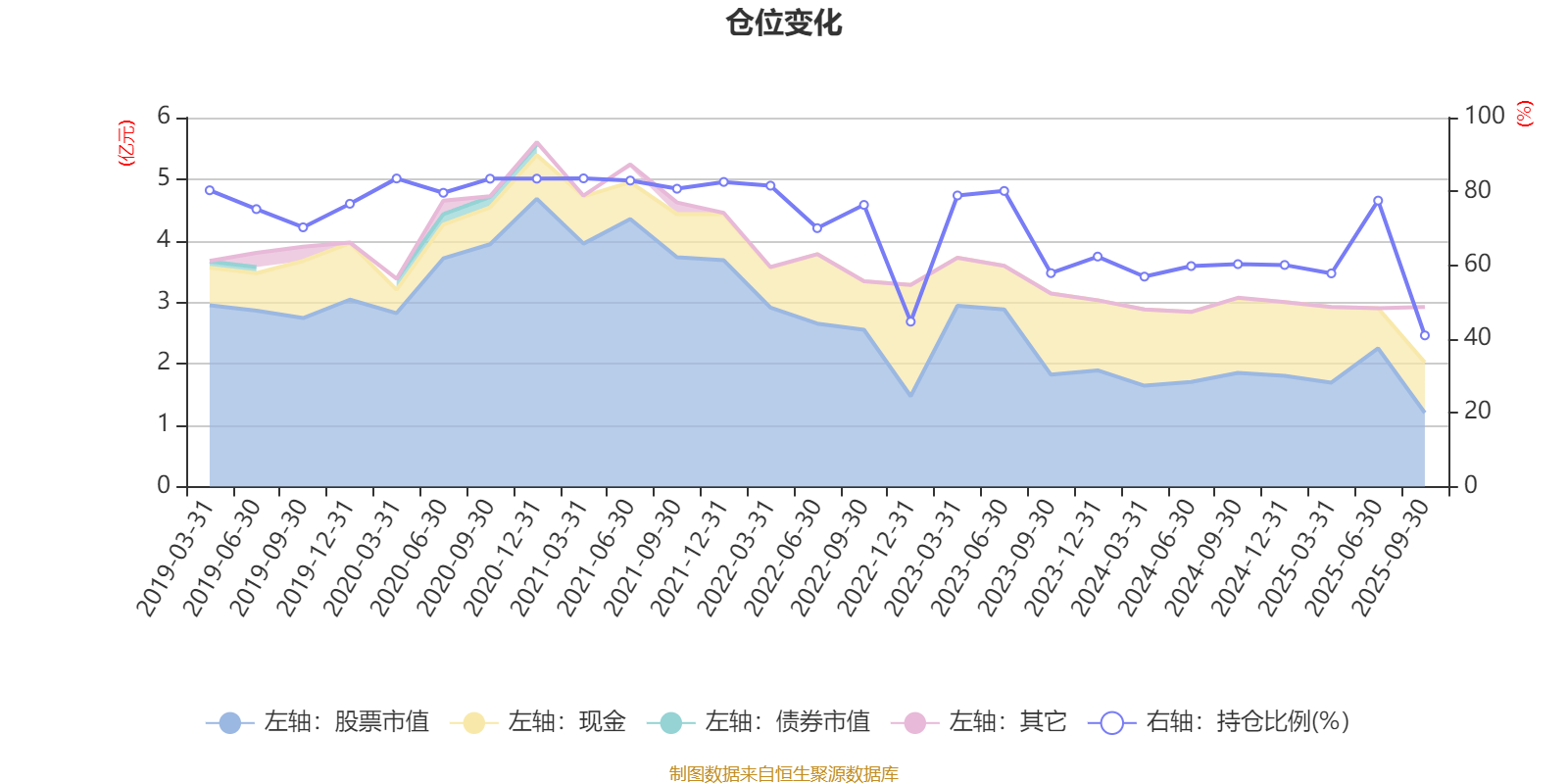 据定期报告数据统计,近三年平均股票仓位为61.43%,同类平均为72.16%。2021年一季度末基金达到83.53%的最高仓位,2025年三季度末最低,为40.97%。