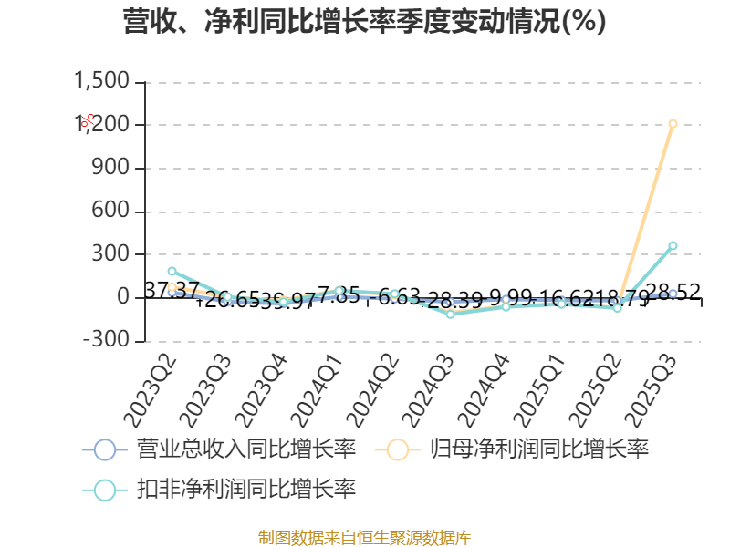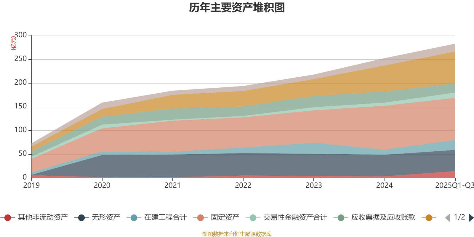 资产重大变化方面,截至2025年三季度末,公司固定资产较上年末减少4.1%,占公司总资产比重下降5.3个百分点;其他非流动资产较上年末增加371.58%,占公司总资产比重上升3.81个百分点;在建工程合计较上年末增加93.62%,占公司总资产比重上升3.13个百分点;应收票据及应收账款较上年末减少17.18%,占公司总资产比重下降2.43个百分点。