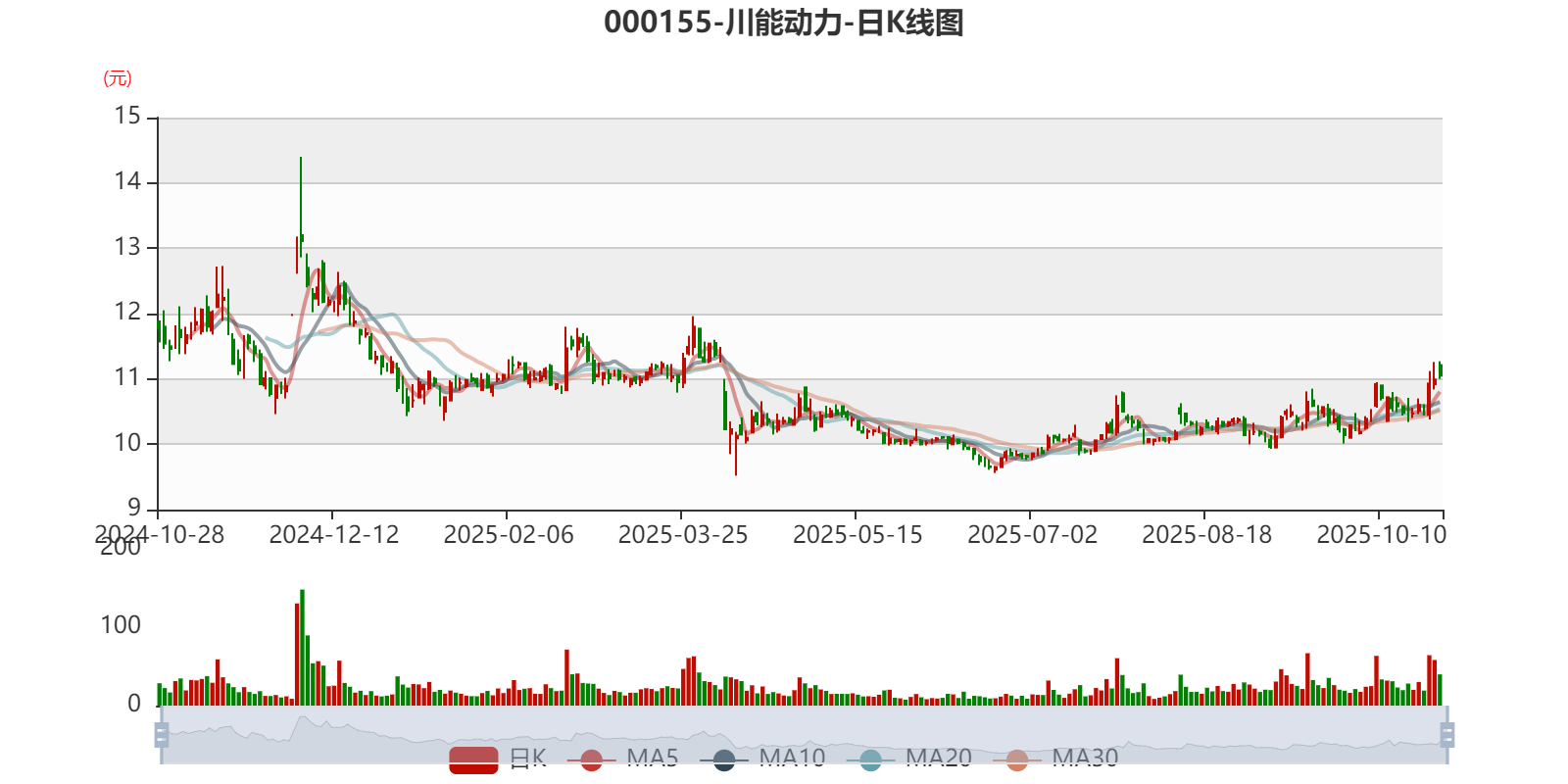 中证智能财讯川能动力(000155)10月28日披露2025年第三季度报告。前三季度公司实现营业总收入20.95亿元,同比下降7.98%;归母净利润3.47亿元,同比下降44.83%;扣非净利润3.35亿元,同比下降45.59%;经营活动产生的现金流量净额为13.22亿元,同比增长6.71%;报告期内,川能动力基本每股收益为0.1882元,加权平均净资产收益率为3.33%。