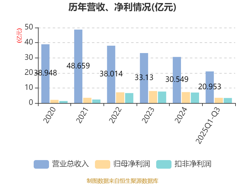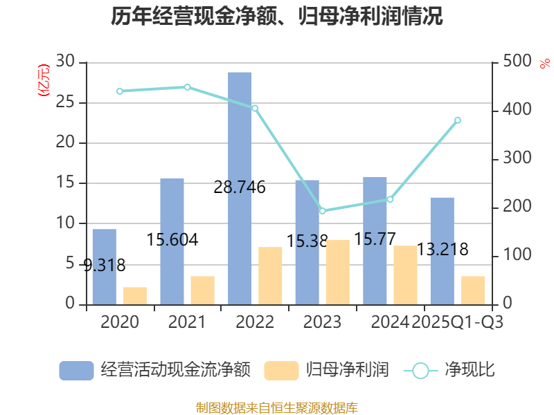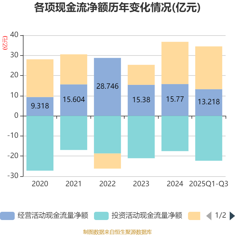 2025年前三季度,公司经营活动现金流净额为13.22亿元,同比增长6.71%;筹资活动现金流净额21.25亿元,同比减少2.23亿元;投资活动现金流净额-22.3亿元,上年同期为-15.6亿元。