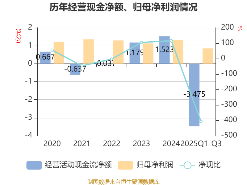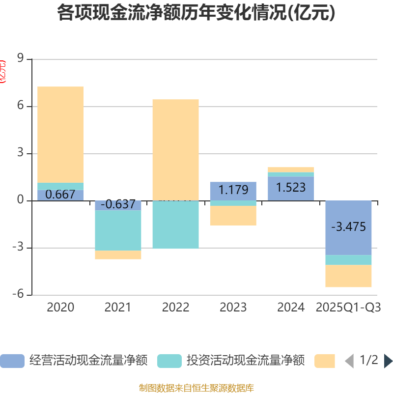 2025年前三季度,公司经营活动现金流净额为-3.47亿元,同比减少2.34亿元;筹资活动现金流净额-1.41亿元,同比减少5506.17万元;投资活动现金流净额-6319.68万元,上年同期为-6503.24万元。