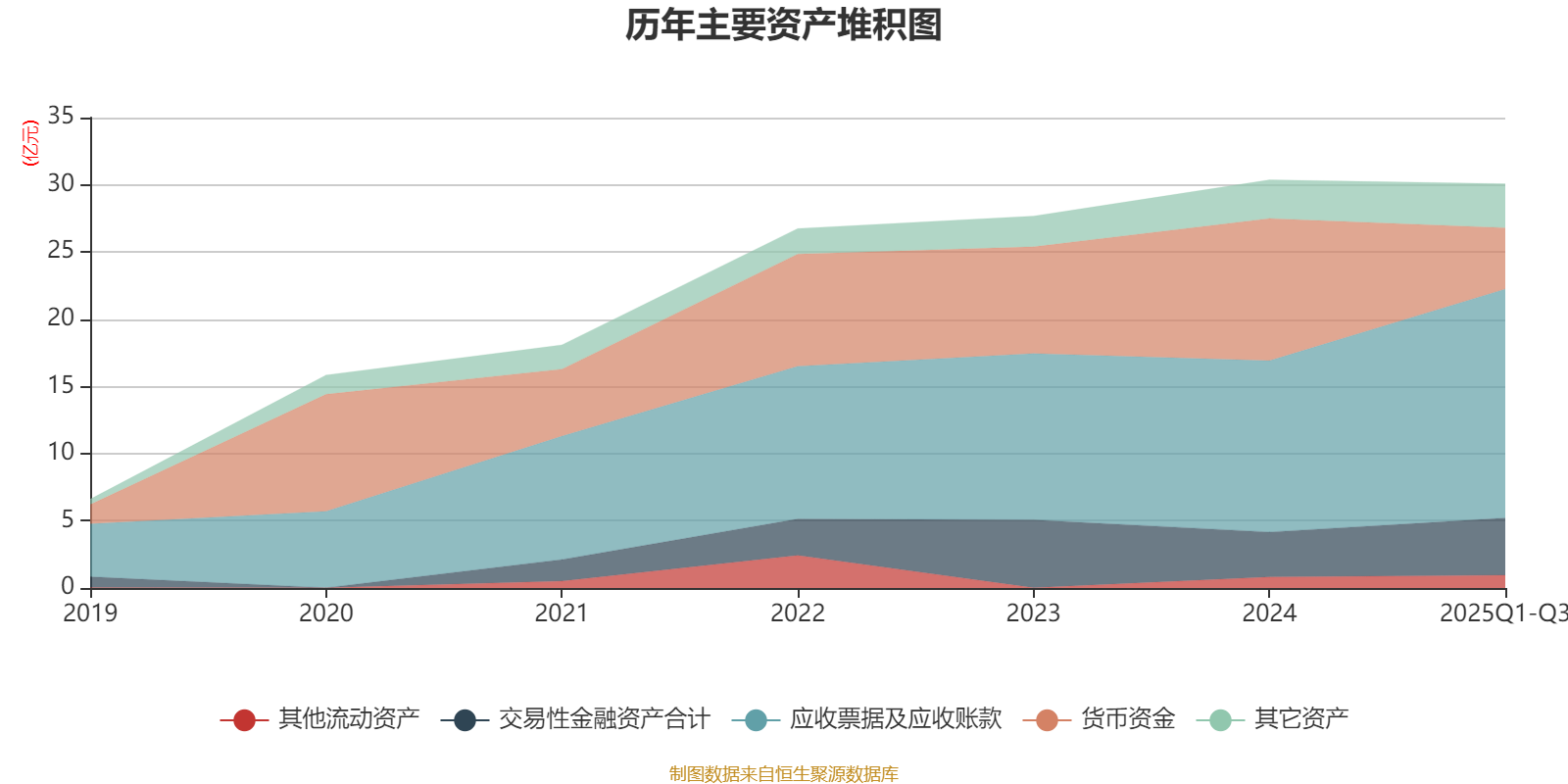 资产重大变化方面,截至2025年三季度末,公司货币资金较上年末减少56.97%,占公司总资产比重下降19.71个百分点;应收票据及应收账款较上年末增加33.69%,占公司总资产比重上升14.68个百分点;交易性金融资产合计较上年末增加26.88%,占公司总资产比重上升3.1个百分点;存货较上年末增加42.24%,占公司总资产比重上升1.04个百分点。