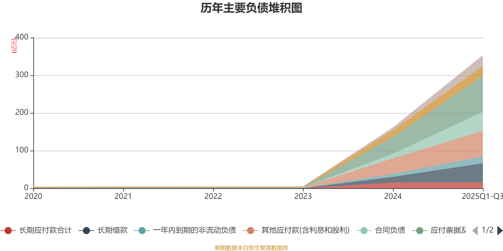 负债重大变化方面,截至2025年三季度末,公司其他应付款(含利息和股利)较上年末增加63.61%,占公司总资产比重下降5.68个百分点;合同负债较上年末增加315.31%,占公司总资产比重上升5.4个百分点;长期应付款合计较上年末增加2.98%,占公司总资产比重下降4.19个百分点;长期借款较上年末增加237.17%,占公司总资产比重上升3.94个百分点。
