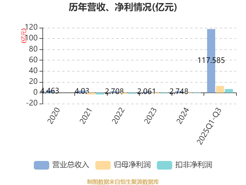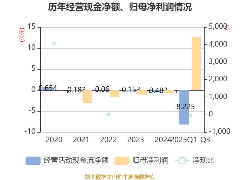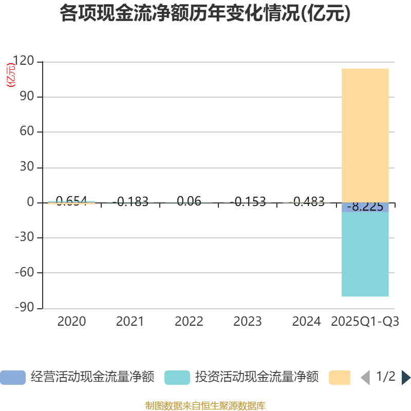 2025年前三季度,公司经营活动现金流净额为-8.22亿元,同比增加13.05亿元;筹资活动现金流净额114.05亿元,同比增加72.65亿元;投资活动现金流净额-71.81亿元,上年同期为-20.96亿元。