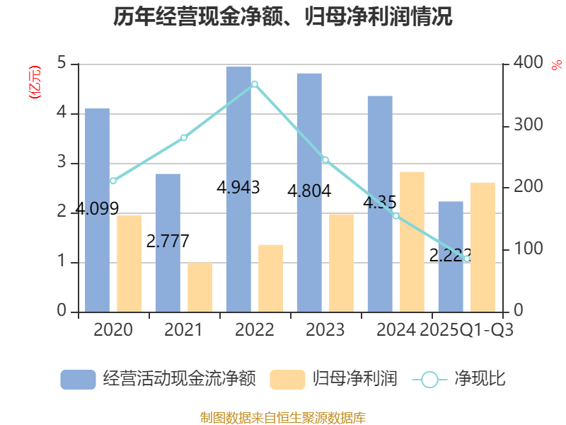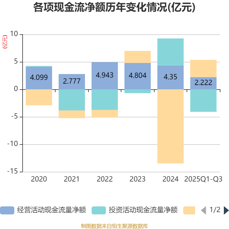 2025年前三季度,公司经营活动现金流净额为2.22亿元,同比下降39.37%;筹资活动现金流净额3.14亿元,同比增加8.86亿元;投资活动现金流净额-4.1亿元,上年同期为1.78亿元。